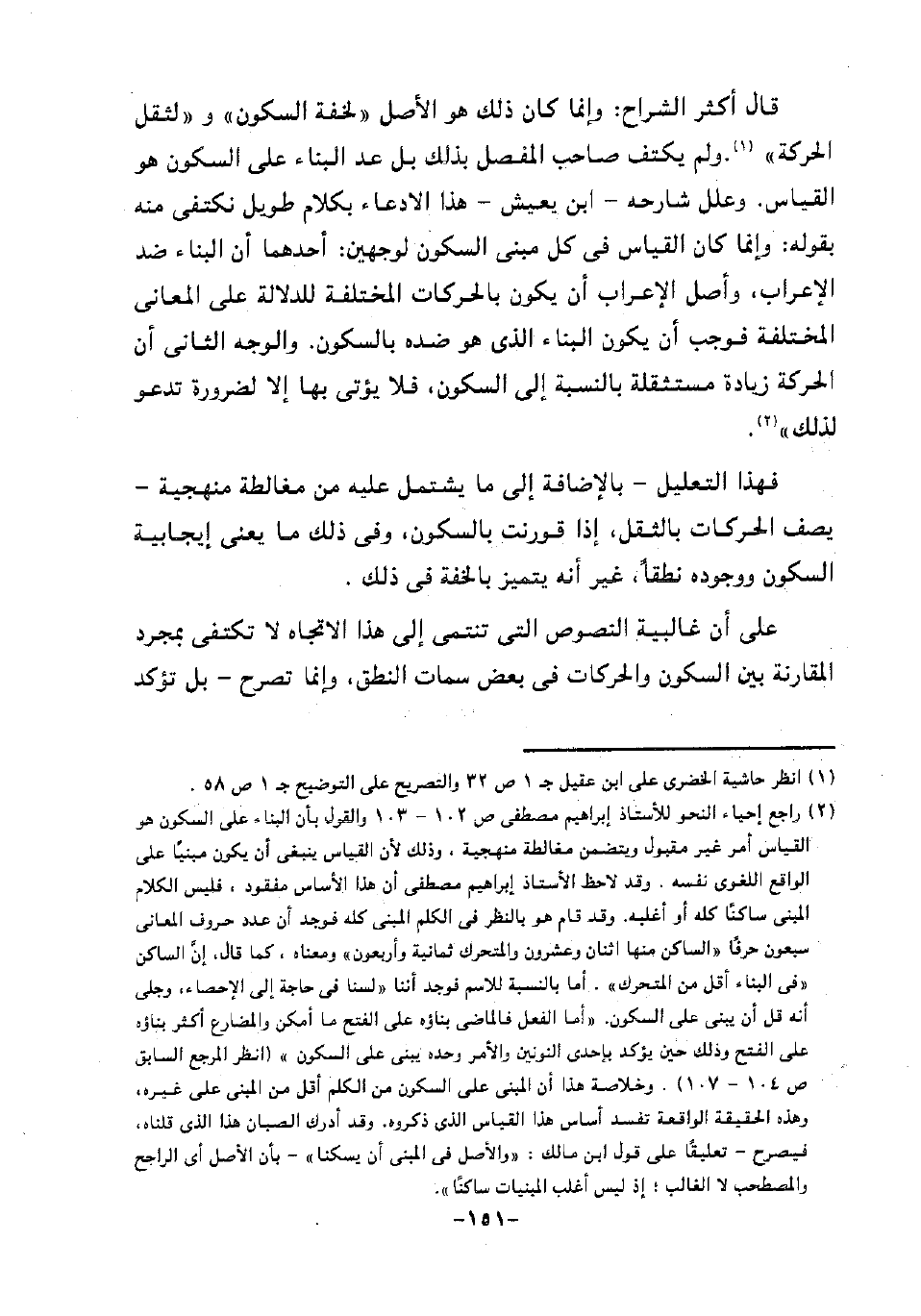 2 راجع إحياء النحو للأستاذ إبراهيم مصطفى ص102-103 والقول بأن البناء على السكون هو القياس أمر غير مقبول ويتضمن مغالطة منهجية. وذلك لأن القياس ينبغي أن يكون مبنيا على الواقع اللغوي نفسه. وقد لاحظ الأستاذ إبراهيم مصطفى أن هذا الأساس مفقود، فليس الكلام المبني ساكنا كله أو أغلبه. وقد قام هو بالنظر في الكلم المبني كله فوجد أن عدد حروف المعاني سبعون حرفا "الساكن منها اثنان وعشرون والمتحرك ثمانية وأربعون" ومعناه، كما قال: إن الساكن "في لبناء اقل من المتحرك". م بالنسبة للاسم فوجد أننا "لسنا في حاجة إلى الإحصاء، وجلي أنه قل أن يبنى على السكون "أما الفعل فالماضي بناؤه على الفتح ما أمكن والمضارع أكثر بناؤه على الفتح وذلك حين يؤكد بإحدى النونين والأمر وحده يبنى على السكون "انظر المرجع السابق ص104-107" وخلاصة هذا أن المبني على السكون من الكلم أقل من المبني على غيره، وهذه الحقيقة الواقعة تفسد أساس هذا القياس الذي ذكروه. وقد أدرك الصبان هذا الذي قلناه، فيصرح -تعليقا على قول ابن مالك: "والأصل في المبني أن يسكنا"- بأن الأصل أي الراجح والمصطحب لا الغالب؛ إذ ليس أغلب المبنيات ساكنا".