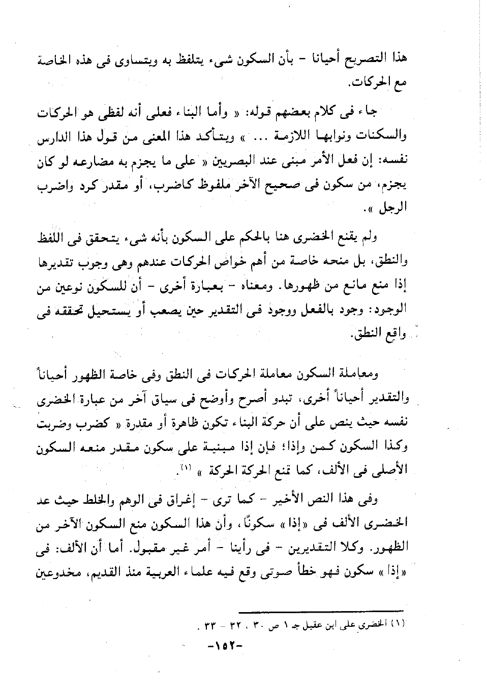 ومعاملة السكون معاملة الحركات في النطق وفي خاصة الظهور أحيانا والتقدير أحيانا أخرى، تبدو أصرح وأوضح في سياق آخر من عبارة الخضري نفسه حيث ينص على أن حركة البناء تكون ظاهرة أو مقدرة "كضرب وضربت وكذا السكون كمن وإذا؛ فإن إذا مبنية على سكون مقدر منعه السكون الأصلي في الألف، كما تمنع الحركة الحركة"1.
