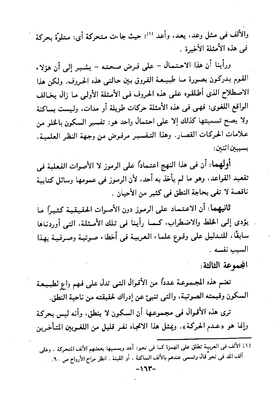 ورأينا أن هذا الاحتمال -على فرض صحته- يشير إلى أن هؤلاء القوم يدركون بصورة ما طبيعة الفروق بين حالتي هذه الحروف. ولكن هذا الاصطلاح الذي أطلقوه على هذه الحروف في الأمثلة الأولى ما زال يخالف الواقع اللغوي، فهي في هذه الأمثلة حركات طويلة أو مدات، وليست بساكنة ولا يصح تسميتها كذلك إلا على احتمال واحد هو: تفسير السكون بالخلو من علامات الحركات القصار. وهذا التفسير مرفوض من وجهة النظر العلمية، بسببين اثنين: