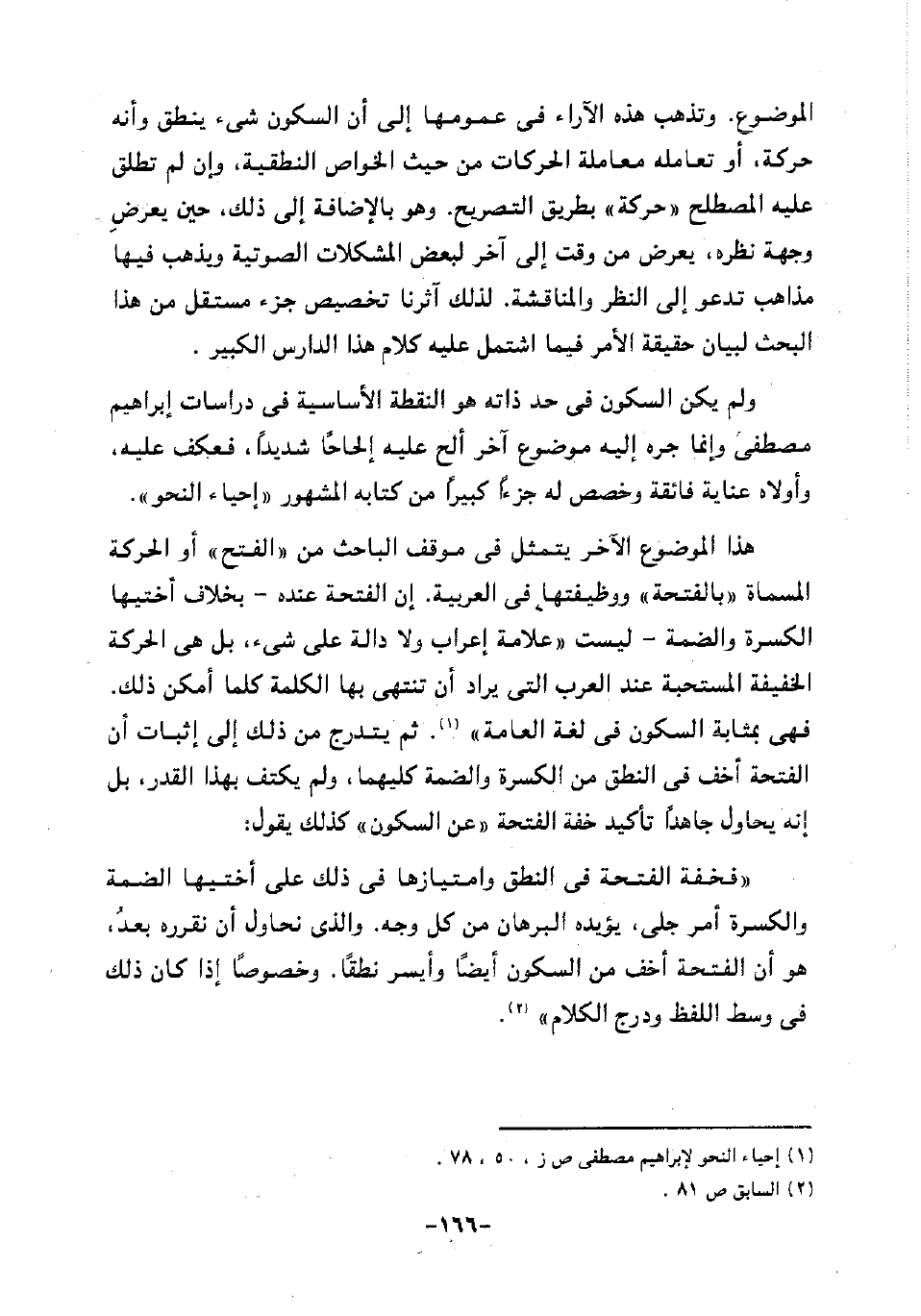 الموضوع. وتذهب هذه الآراء في عمومها إلى أن السكون شيء ينطق وأنه حركة، أو تعامله معاملة الحركات من حيث الخواص النطقية، وإن لم تطلق عليه المصطلح "حركة" بطريق التصريح. وهو بالإضافة إلى ذلك، حين يعرض وجهة نظره، يعرض من وقت إلى آخر لبعض المشكلات الصوتية ويذهب فيها مذاهب تدعو إلى النظر والمناقشة. لذلك آثرنا تخصيص جزء مستقل من هذا البحث لبيان حقيقة الأمر فيما اشتمل عليه كلام هذا الدارس الكبير.