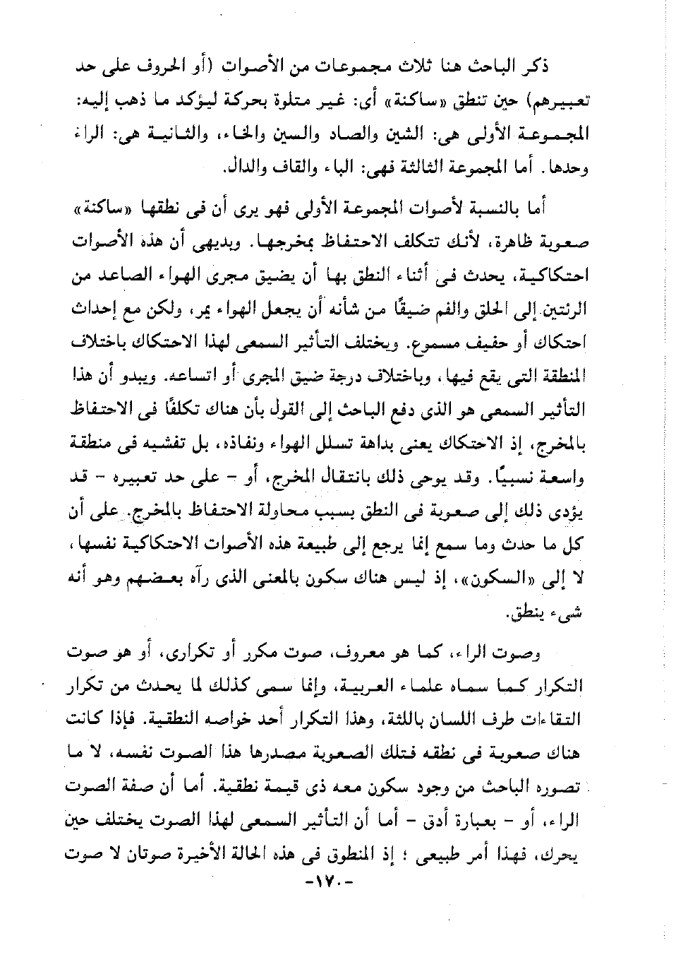 وصوت الراء، كما هو معروف، صوت مكرر وتكراري، أو هو صوت التكرار كما سماه علماء العربية، وإنما سمي كذلك لما يحدث من تكرار التقاءات طرف اللسان باللثة، وهذا التكرار أحد خواصه النطقية. فإذا كانت هناك صعوبة في نطقه فتلك الصعوبة مصدرها هذا الصوت نفسه، لا ما تصوره الباحث من وجود سكون معه ذي قيمة نطقية. أما أن صفة الصوت الراء، أو -بعبارة أدق- أما أن التأثير السمعي لهذا الصوت يختلف حين يحرك، بهذا أمر طبيعي؛ إذ المنطوق في هذه الحالة الأخيرة صوتان لا صوت
