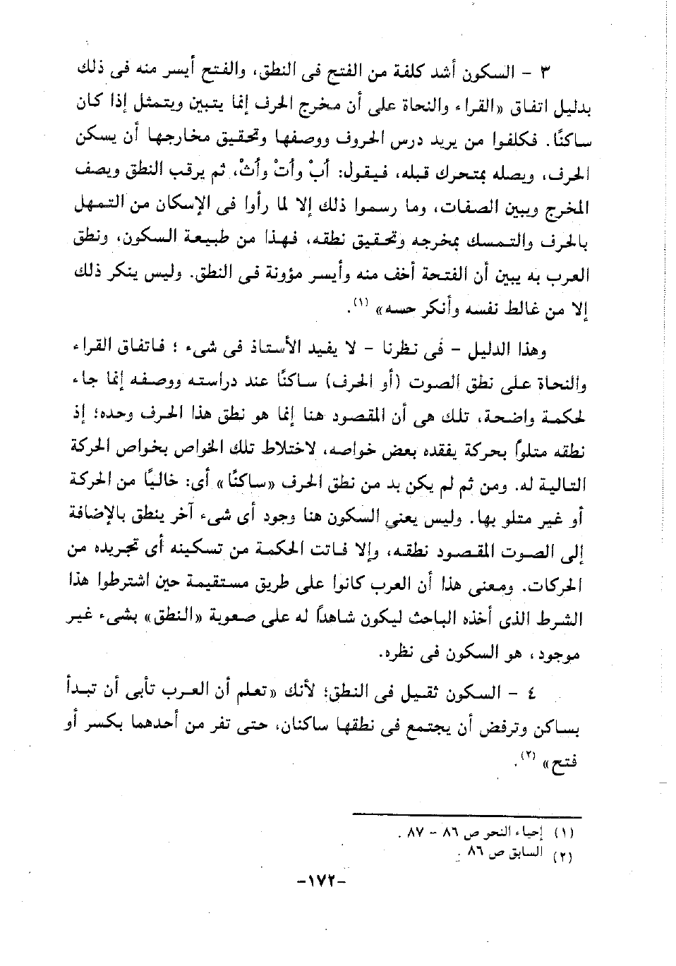وهذا الدليل -في نظرنا- لا يفيد الأستاذ في شيء، فاتفاق القراء والنحاة على نطق الصوت "أو الحرف" ساكنا عند دراسته ووصفه إنما جاء لحكمة واضحة، تلك هي أن المقصود هنا إنما هو نطق هذا الحرف وحده، إذ نطقه متلوا بحركة يفقده بعض خواصه، لاختلاط تلك الخواص بخواص الحركة التالية له. ومن ثم لم يكن بد من نطق الحرف "ساكنا" أي: خاليا من الحركة أو غير متلو بها. وليس يعني السكون هنا وجود أي شيء آخر ينطق بالإضافة إلى الصوت المقصود نطقه، وإلا فاتت الحكمة من تسكينه أي تجريده من الحركات. ومعنى هذا أن العرب كانوا على طريق مستقيمة حين اشترطوا هذا الشرط الذي أخذ الباحث ليكون شاهدا له على صعوبة "النطق" بشيء غير موجود، هو السكون في نظره.