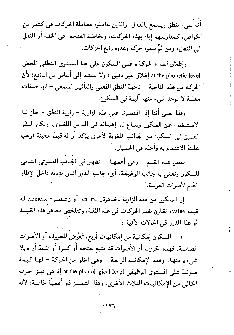 وإطلاق اسم "الحركة" على السكون على هذا المستوى النطقي المحض at the phonetic level إطلاق غير دقيق، ولا يستند إلى أساس من الواقع، لأن الحركة من هذه الناحية -ناحية النطق الفعلي والتأثير السمعي- لها صفات معينة لا يوجد شيء منها ألبتة في السكون.