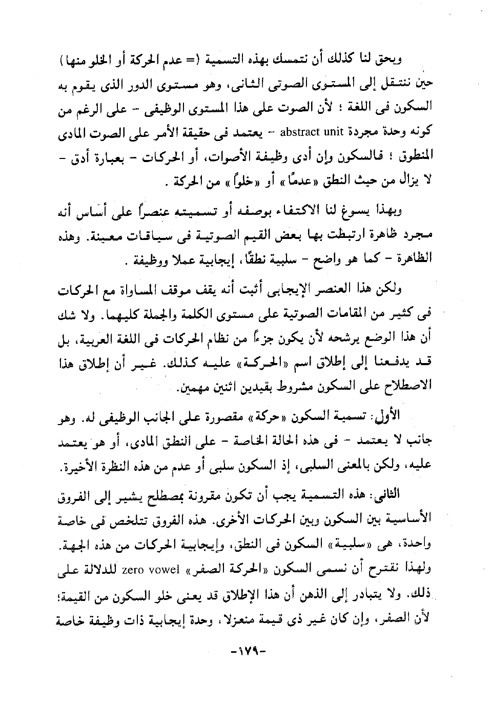 الثاني: هذه التسمية يجب أن تكون مقرونة بمصطلح يشير إلى الفروق الأساسية بين السكون وبين الحركات الأخرى. هذه الفروق تتلخص في خاصة واحدة، هي "سلبية" السكون في النطق، وإيجابية الحركات من هذه الجهة. ولهذا نقترح أن نسمي السكون "الحركة الصفر" zoro vowel للدلالة على ذلك. ولا يتبادر إلى الذهن أن هذا الإطلاق قد يعني خلو السكون من القيمة، لأن الصفر، وإن كان غير ذي قيمة منعزلا، وحدة إيجابية ذات وظيفة خاصة