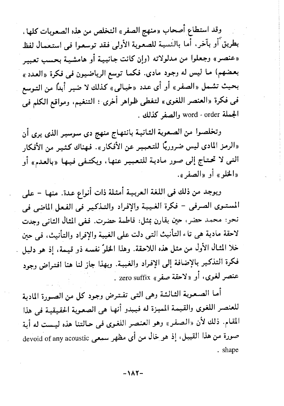 أما الصعوبة الثالثة وهي التي تفترض وجود كل من الصورة المادية للعنصر اللغوي والقيمة المميزة له فيبدو أنها هي الصعوبة الحقيقية في هذا المقام. وذلك لأن "الصفر" وهو العنصر اللغوي في حالتنا هذه ليست له أية صورة من هذا القبيل، إذ هو خال من أي مظهر سمعي devoid of any acoustic shape.
