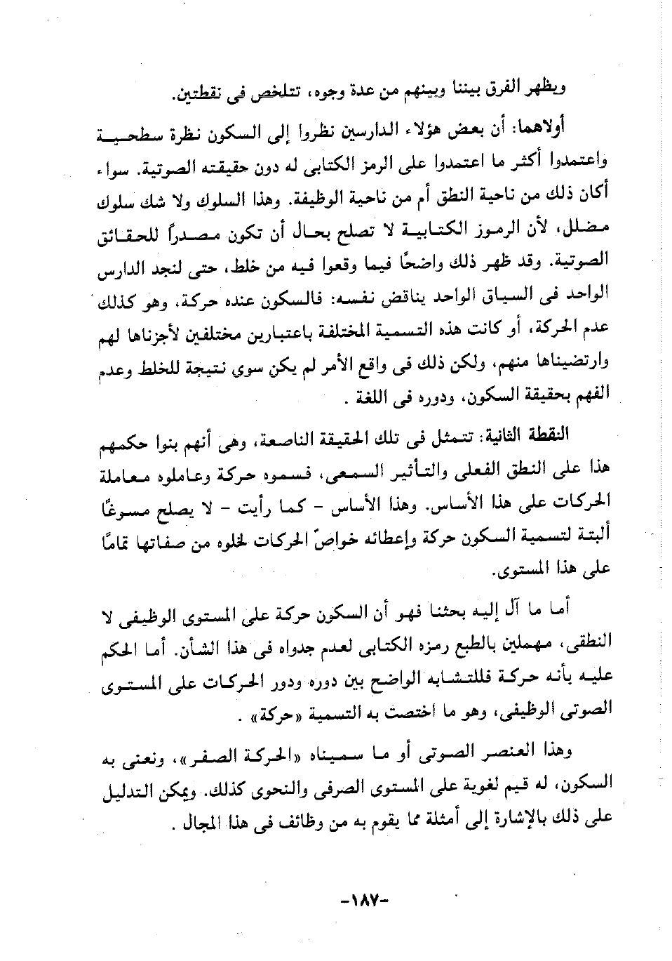 أولاهما: أن بعض هؤلاء الدارسين نظروا إلى السكون نظرة سطحية واعتمدوا أكثر ما اعتمدوا على الرمز الكتابي له دون حقيقته الصوتية. سواء أكان ذلك من ناحية النطق أم من ناحية الوظيفة. وهذا السلوك ولا شك سلوك مضلل، لأن الرموز الكتابية لا تصلح بحال أن تكون مصدرا للحقائق الصوتية. وقد ظهر ذلك واضحا فيما وقعوا فيه من خلط، حتى لنجد الدارس الواحد في السياق الواحد يناقض نفسه؛ فالسكون عنده حركة، وهو كذلك عدم الحركة، أو كانت هذه التسمية المختلفة باعتبارين مختلفين لأجزناها لهم وارتضيناها منهم، ولكن ذلك في واقع الأمر لم يكن سوى نتيجة للخلط وعدم الفهم بحقيقة السكون، ودوره في اللغة.