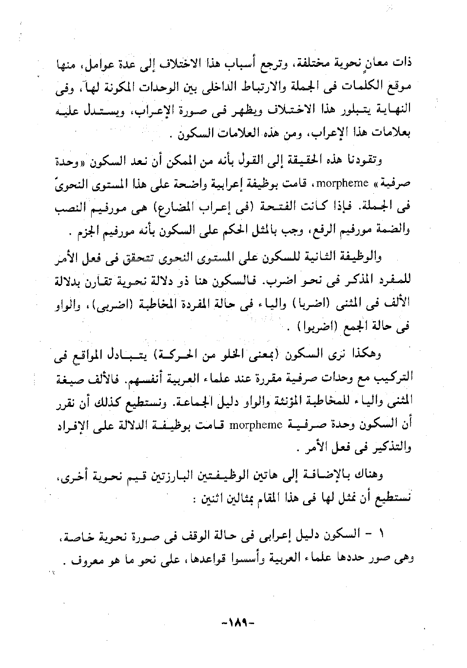 وتقودنا هذه الحقيقة القول بأنه من الممكن أن نعد السكون "وحدة صرفية" morpheme، قامت بوظيفة إعرابية واضحة على هذا المستوى النحوي في الجملة. فإذا كانت الفتحة "في إعراب المضارع" هي مورفيم النصب والضمة مورفيم الرفع، وجب بالمثل الحكم على السكون بأنه مورفيم الجزم.