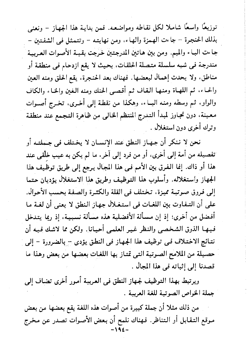 نحن لا ننكر أن جهاز النطق عند الإنسان لا يختلف في جملته أو تفصيله من أمة إلى أخرى، أو من فرد إلى آخر، ما لم يكن به عيب خلقي عند هذا أو ذاك. إنما الفرق بين الأمم في هذا المجال يرجع إلى طريق توظيف هذا الجهاز واستغلاله. وأسلوب هذا التوظيف وطريق هذا الاستغلال يؤديان حتما إلى فروق صوتية مميزة، تختلف في القلة والكثرة والصفة بحسب الأحوال. على أن التفاوت بين اللغات في استغلال جهاز النطق لا يعني أن لغة ما أفضل من أخرى؛ إذ إن مسألة الأفضلية هذه مسألة نسبية، إذ ربما يتدخل فيها الذوق الشخصي والنظر غير العلمي أحيانا. ولكن مما لا شك فيه أن نتائج الاختلاف في توظيف هذا الجهاز في النطق يؤدي -بالضرورة- إلى حصيلة من الملامح الصوتية التي تمتاز بها اللغات بعضها من بعض وهذا ما قصدنا إلى إثباته في هذا المجال.