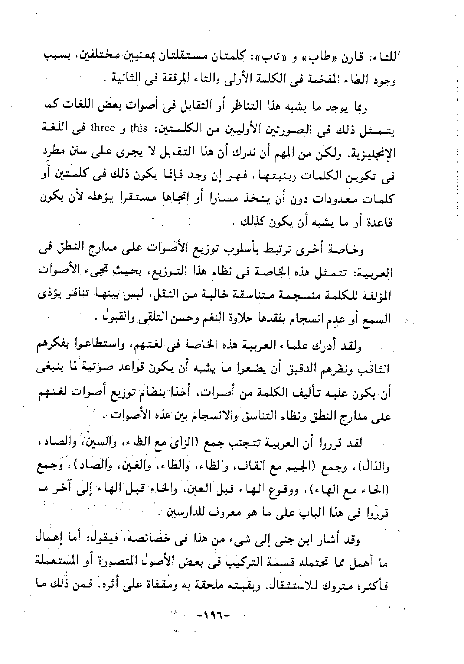 لقد قرروا أن العربية تتجنب جمع "الزاي مع الظاء، والسين، والصاد، والذال"، وجمع "الجيم مع القاف، والظاء، والطاء، والغين، والصاد"، وجمع "الحاء مع الهاء"، ووقوع الهاء قبل العين، والخاء قبل الهاء إلى آخر ما قرروا في هذا الباب على ما هو معروف للدارسين.