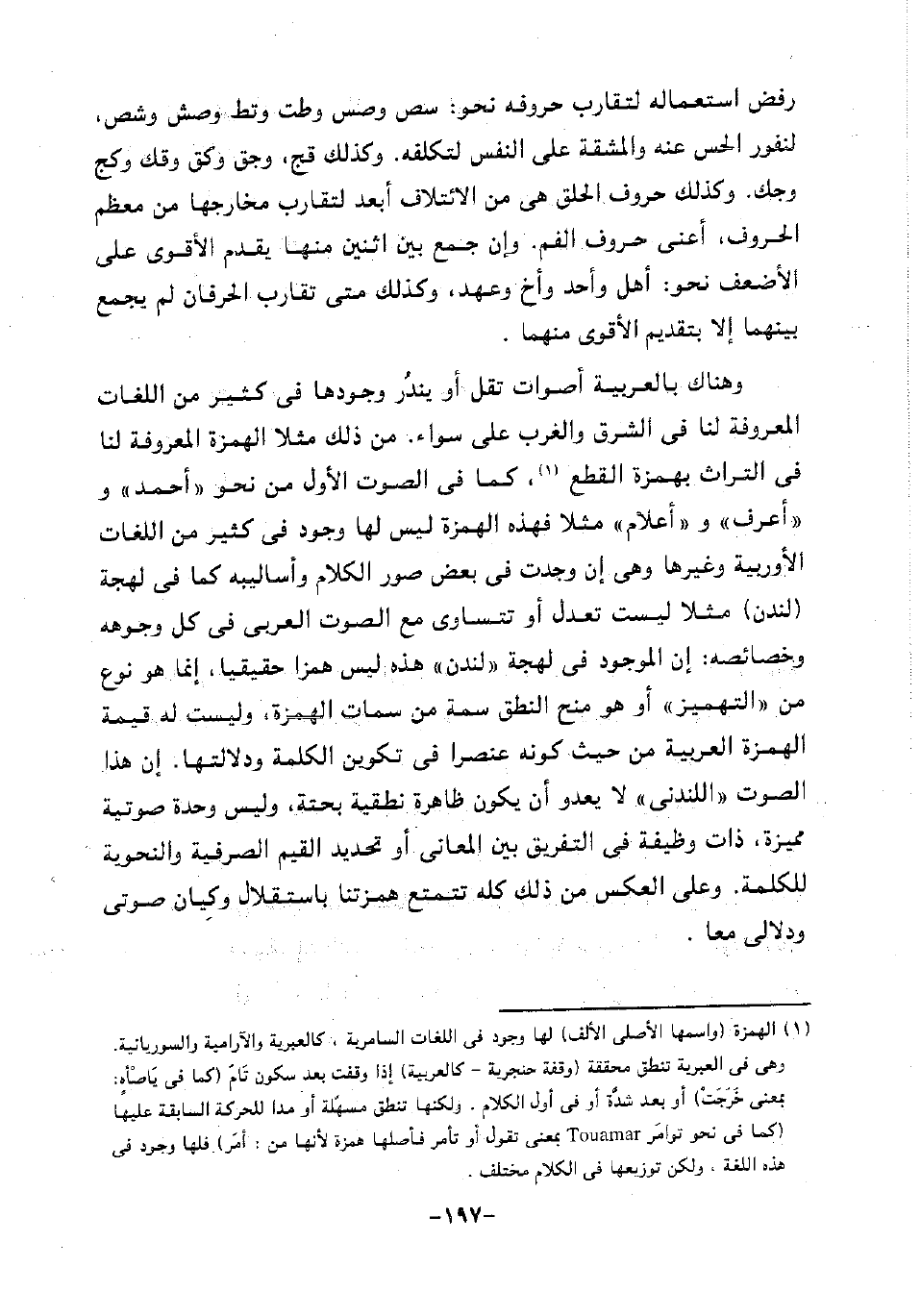 وهناك بالعربية أصوات تقل أو يندر وجودها في كثير من اللغات المعروفة لنا في الشرق والغرب على سواء. من ذلك مثلا الهمزة المعروفة لنا في التراث بهمزة القطع1، كما في الصوت الأول من نحو "أحمد" و"أعرف" و"أعلام" مثلا فهذه الهمزة ليس له وجود في كثير من اللغات الأوربية وغيرها وهي إن وجدت في بعض صور الكلام وأساليبه كما في لهجة "لندن" مثلا ليست تعدل أو تتساوى مع الصوت العربي في كل وجوهه وخصائصه: إن الموجود في لهجة "لندن" هذه ليس همزا حقيقيا، إنما هو نوع من "التهميز" أو هو منح النطق سمة من سمات الهمزة، وليست له قيمة الهمزة العربية من حيث كونه عنصرا في تكوين الكلمة ودلالتها. إن هذا الصوت "اللندني" لا يعدو أن يكون ظاهرة نطقية بحتة، وليس وحدة صوتية مميزة، ذات وظيفة في التفريق بين المعاني أو تحديد القيم الصرفية والنحوية للكلمة. وعلى العكس من ذلك كله تتمتع همزتنا باستقلال وكيان صوتي ودلالي معا.