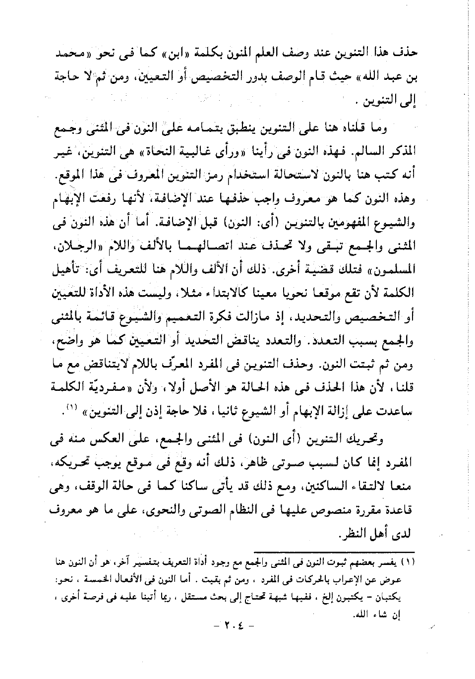 1 يفسر بعضهم ثبوت النون في المثنى والجمع مع وجود أداة التعريف بتفسير آخر، هو أن النون هنا عوض عن الإعراب بالحركات في المفرد. ومن ثم بقيت. أما النون في الأفعال الخمسة. نحو: يكتبان، يكتبون، إلخ، ففيها شبهة تحتاج إلى بحث مستقل، ربما أتينا عليه في فرصة أخرى، إن شاء الله.