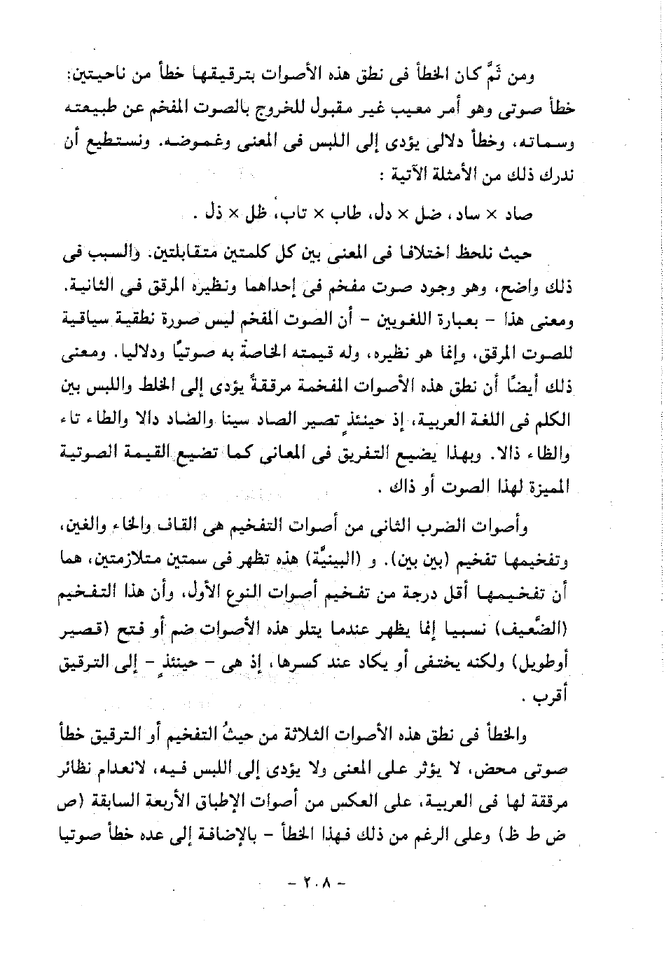 حيث نلحظ اختلافا في المعنى بين كل كلمتين متقابلتين. والسبب في ذلك واضح، وهو وجود صوت مفخم في إحداهما ونظيره المرقق في الثانية معنى هذا -بعبارة اللغويين- أن الصوت المفخم ليس صورة نطقية سياقية للصوت المرقق، وإنما هو نظيره، وله قيمته الخاصة به صوتيا ودلاليا. ومعنى ذلك أيضا أن نطق هذه الأصوات المفخمة مرققة يؤدي إلى الخلط واللبس بين الكلم في اللغة العربية، إذ حينئذ تصير الصاد سينا والضاد دالا والطاء تاء والظاء ذالا. وبهذا يضيع التفريق في المعاني كما تضيع القيمة الصوتية المميزة لهذا الصوت أو ذاك.