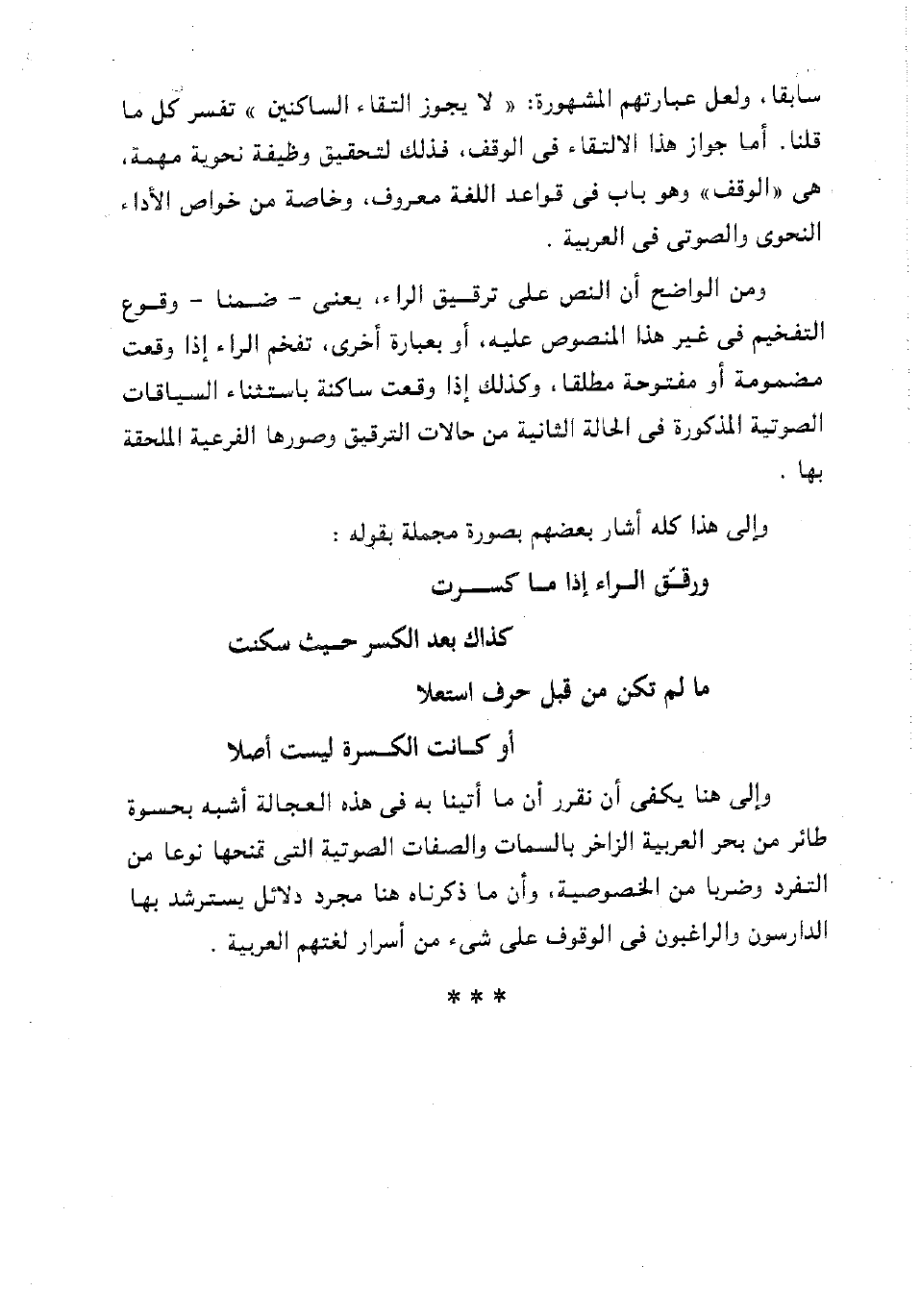 سابقا، ولعل عبارتهم المشهورة: "لا يجوز التقاء الساكنين" تفسر كل ما قلنا. أما جواز هذا الالتقاء في الوقف، فذلك لتحقيق وظيفة نحوية مهمة، هي "الوقف" وهو باب في قواعد اللغة معروف، وخاصة من خواص الأداء النحوي والصوتي في العربية.