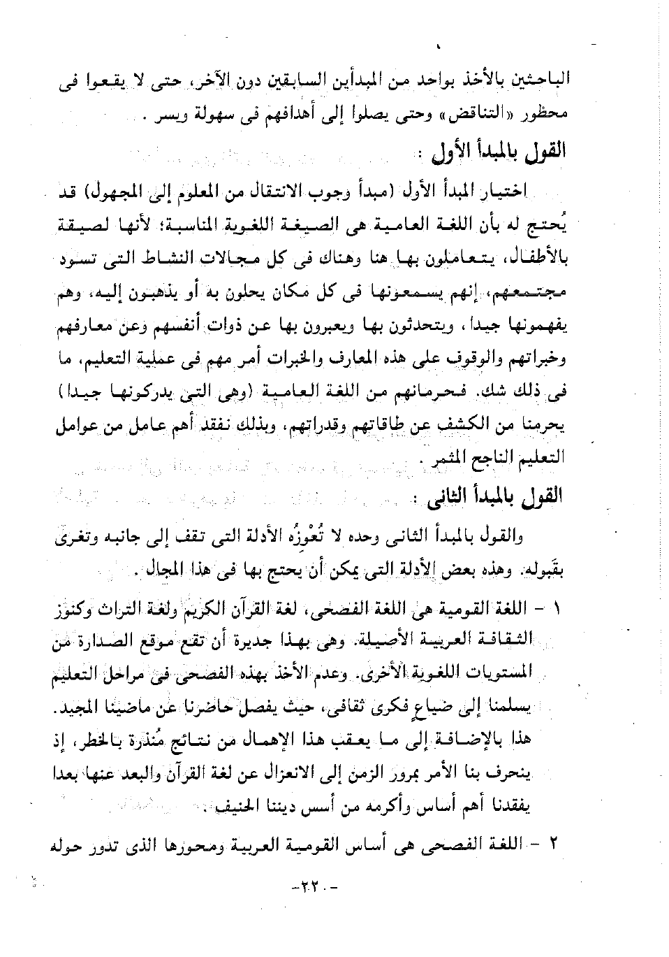 1- اللغة القومية هي اللغة الفصحى، لغة القرآن الكريم ولغة التراث وكنوز الثقافة العربية الأصيلة. وهي بهذا جديرة أن تقع موقع الصدارة من المستويات اللغوية الأخرى. وعدم الأخذ بهذه الفصحى في مراحل التعليم يسلمنا إلى ضياع فكري ثقافي، حيث يفصل حاضرنا عن ماضينا المجيد. هذا بالإضافة إلى ما يعقب هذا الإهمال من نتائج منذرة بالخطر، إذ ينحرف بنا الأمر بمرور الزمن إلى الانعزال عن لغة القرآن والبعد عنها بعدا يفقدنا أهم أساس وأكرمه من أسس ديننا الحنيف.