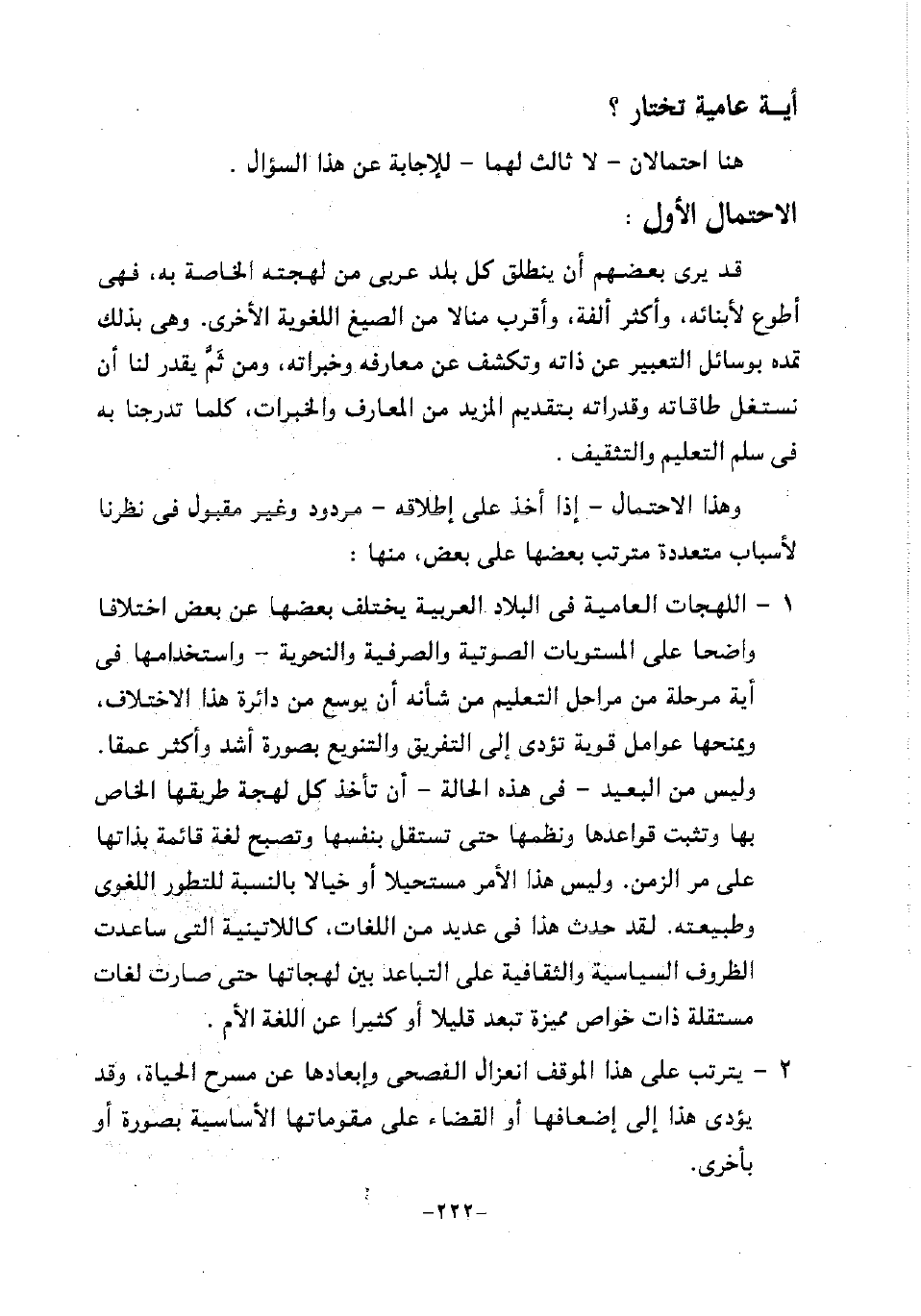 2- يترتب على هذا الموقف انعزال الفصحى وإبعادها عن مسرح الحياة، وقد يؤدي إلى إضعافها أو القضاء على مقوماتها الأساسية بصورة أو بأخرى.