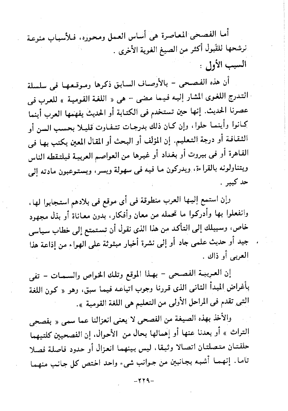 إن العربية الفصحى -بهذا الموقع وتلك الخواص والسمات- تفي بأغراض المبدأ الثاني الذي قررنا وجوب اتباعه فيما سبق، وهو "كون اللغة التي تقدم في المراحل الأولى من التعليم هي اللغة القومية".