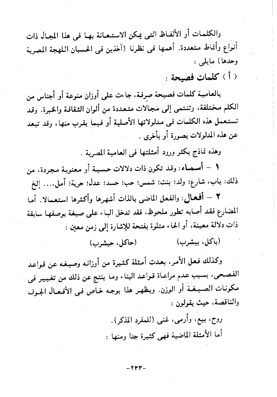 بالعامية كلمات فصيحة صرفة، جاءت على أوزان منوعة أو أجناس من الكلم المختلفة، وتنتمي إلى مجالات متعددة من ألوان الثقافة والخبرة. وقد تستعمل هذه الكلمات في مدلولاتها الأصلية أو فيما يقرب منها، وقد تبعد عن هذه المدلولات بصورة أو بأخرى.