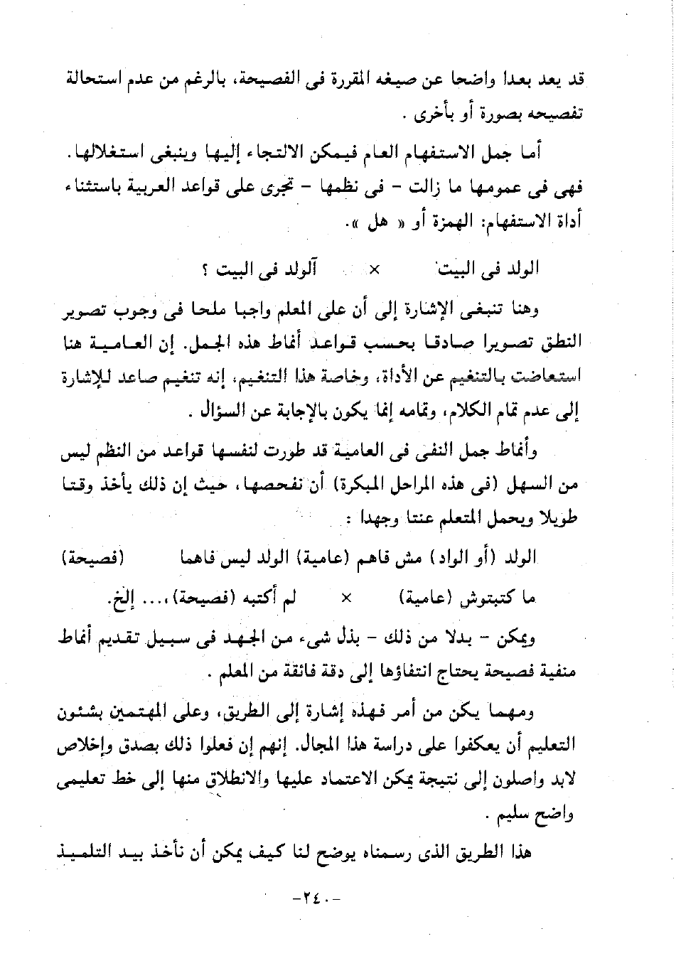 وأنماط جمل النفي في العامية قد طورت لنفسها قواعد من النظم ليس من السهل "في هذه المراحل المبكرة" أن نفحصها، حيث إن ذلك يأخذ وقتا طويلا ويحمل المتعلم عنتا وجهدا: