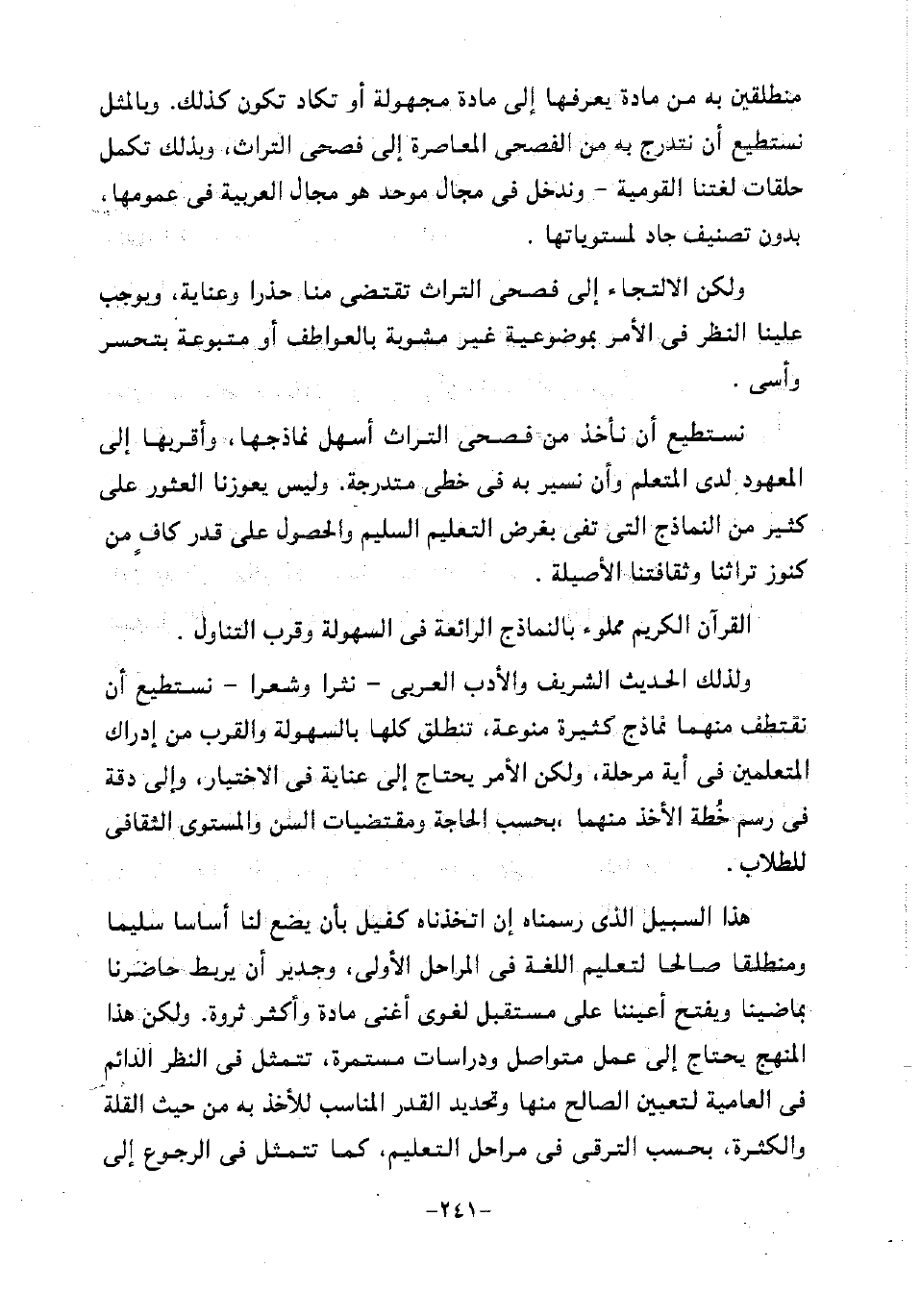 نستطيع أن نأخذ من فصحى التراث أسهل نماذجها، وأقربها إلى المعهود لدى المتعلم وأن نسير به في خطى متدرجة. وليس يعوزنا العثور على كثير من النماذج التي تفي بغرض التعليم السليم والحصول على قدر كاف من كنوز تراثنا وثقافتنا الأصيلة.