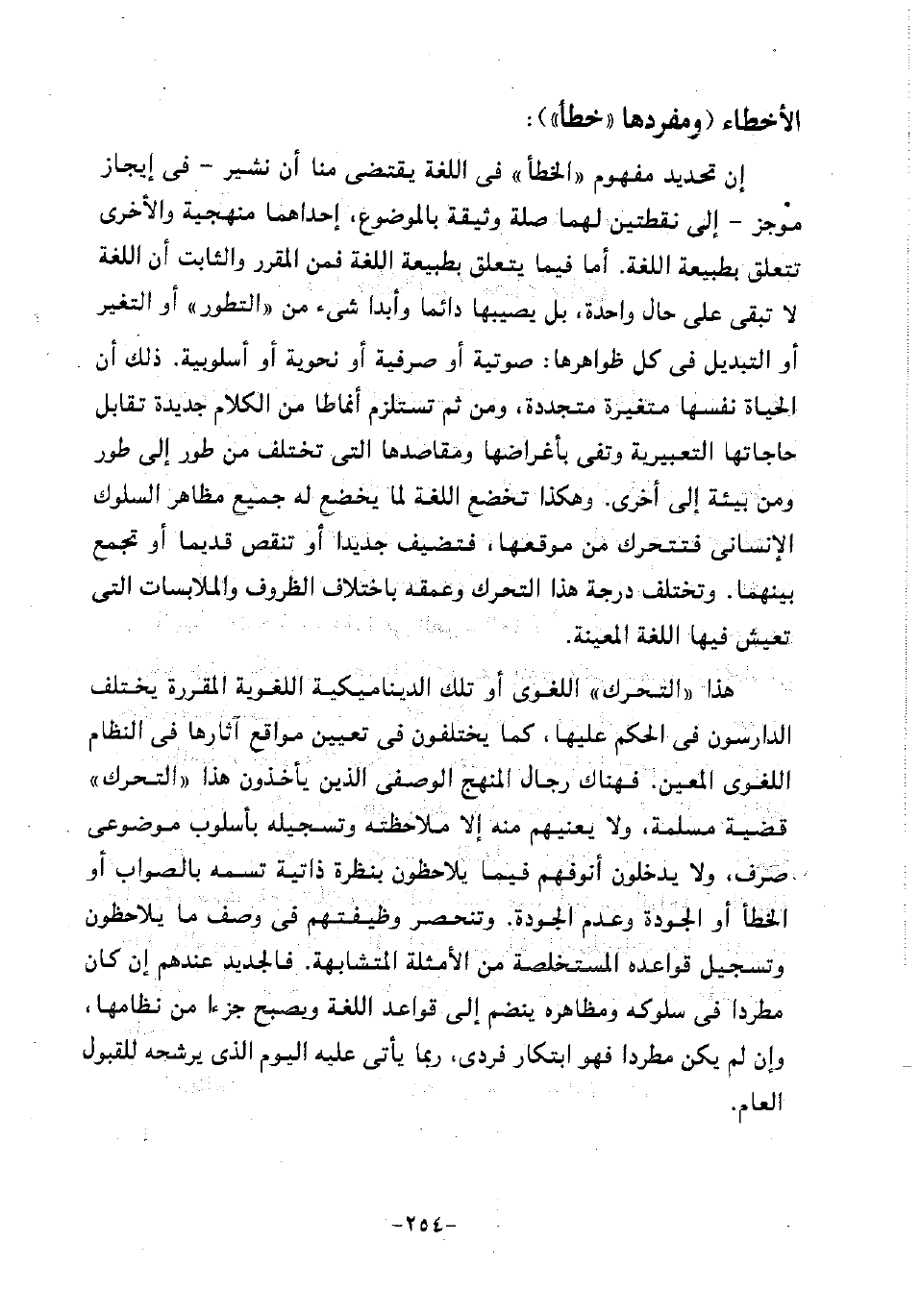 إن تحديد مفهوم "الخطأ" في اللغة يقتضي منا أن نشير -في إيجاز موجز- إلى نقطتين لهما صلة وثيقة بالموضوع، إحداهما منهجية والأخرى تتعلق بطبيعة اللغة. أما فيما يتعلق بطبيعة اللغة فمن المقرر والثابت أن اللغة لا تبقى على حال واحدة، بل يصيبها دائما وأبدا شيء من "التطور" أو التغير أو التبديل في كل ظواهرها: صوتية أو صرفية أو نحوية أو أسلوبية. ذلك أن الحياة نفسها متغيرة متجددة، ومن ثم تستلزم أنماطا من الكلام جديدة تقابل حاجاتها التعبيرية وتفي بأغراضها ومقاصدها التي تختلف من طور إلى طور ومن بيئة إلى أخرى. وهكذا تخضع اللغة لما يخضع له جميع مظاهر السلوك الإنساني فتتحرك من موقعها، فتضيف جديدا أو تنقص قديما أو تجمع بينهما. وتختلف درجة هذا التحرك وعمقه باختلاف الظروف والملابسات التي تعيش فيها اللغة المعينة.