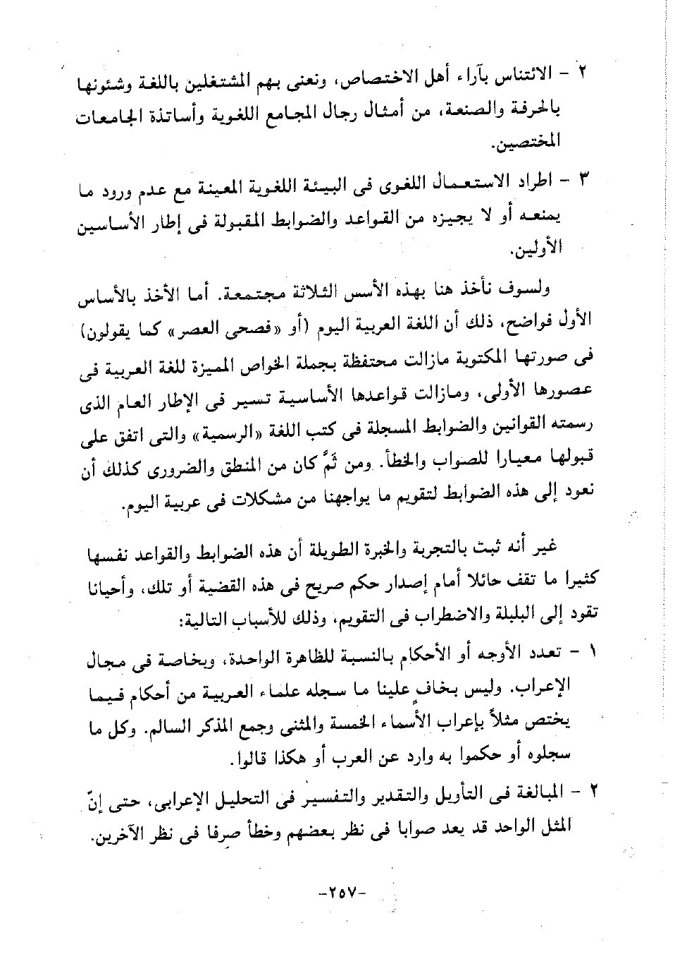 ولسوف نأخذ هنا بهذه الأسس الثلاثة مجتمعة. أما الأخذ بالأساس الأول فواضح، ذلك أن اللغة العربية اليوم "أو "فصحى العصر" كما يقولون" في صورتها المكتوبة مازالت محتفظة بجملة الخواص المميزة للغة العربية في عصورها الأولى، ومازالت قواعدها الأساسية تسير في الإطار العام الذي رسمته القوانين والضوابط المسجلة في كتب اللغة "الرسمية" والتي اتفق على قبولها معيارا للصواب والخطأ. ومن ثم كان من المنطق والضروري كذلك أن نعود إلى هذه الضوابط لتقويم ما يواجهنا من مشكلات في عربية اليوم.