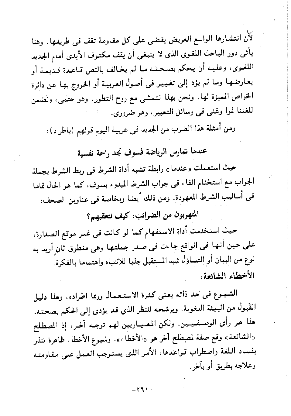لأن انتشارها الواسع العريض يقضي على كل مقاومة تقف في طريقها. وهنا يأتي دور الباحث اللغوي الذي لا ينبغي أن يقف مكتوف الأيدي أمام الجديد اللغوي، وعليه أن يحكم بصحته ما لم يخالف بالنص قاعدة قديمة أو يعارضها وما لم يؤد إلى تغيير في أصول العربية أو الخروج بها عن دائرة الخواص المميزة لها. ونحن بهذا نتمشى مع روح التطور، وهو حتمي، ونضمن للغتنا نموا وغنى في وسائل التعبير. وهو ضروري.