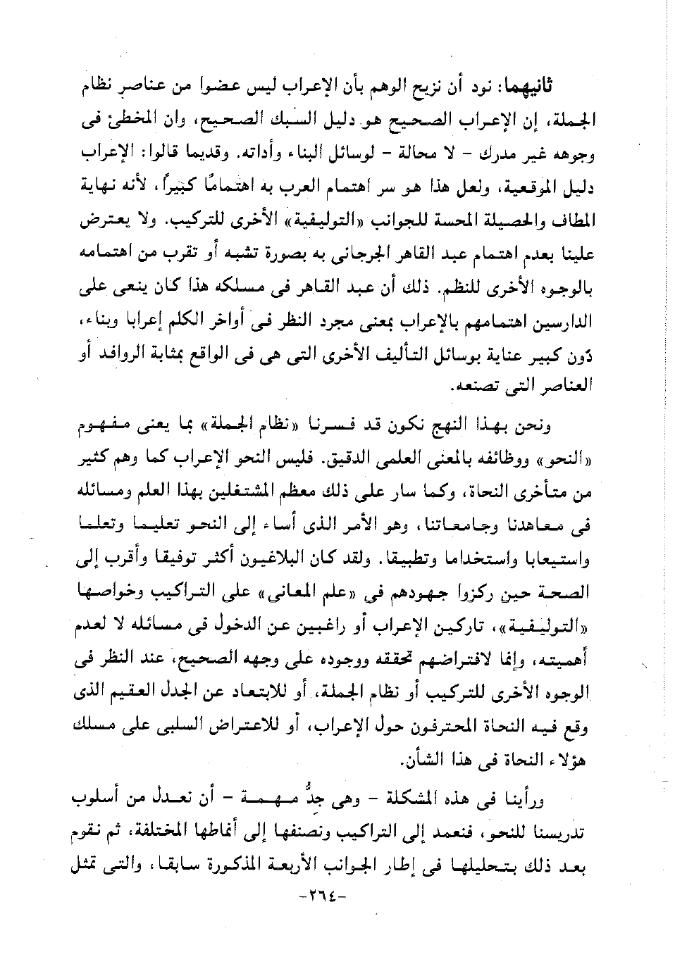 ثانيهما: نود أن نزيح الوهم بأن الإعراب ليس عضوا من عناصر نظام الجملة، إن الإعراب الصحيح هو دليل السبك الصحيح، وأن المخطئ في وجوهه غير مدرك -لا محالة- لوسائل البناء وأداته. وقديما قالوا: الإعراب دليل الموقعية. ولعل هذا هو سر اهتمام العرب به اهتماما كبيرا، لأنه نهاية المطاف والحصيلة المحسة للجوانب "التوليفية" الأخرى للتركيب. ولا يعترض علينا بعدم اهتمام عبد القاهر الجرجاني به بصورة تشبه أو تقرب من اهتمامه بالوجوه الأخرى للنظم. ذلك أن عبد القاهر في مسلكه هذا كان ينعى على الدارسين اهتمامهم بالإعراب بمعنى مجرد النظر في أواخر الكلم إعرابا وبناء، دون كبير عناية بوسائل التأليف الأخرى التي هي في الواقع بمثابة الروافد أو العناصر التي تصنعه.