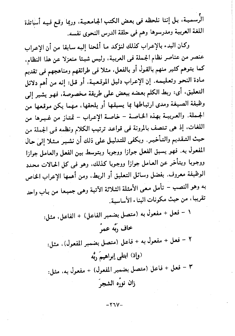 وكان البدء بالإعراب كذلك لنؤكد ما ألمحنا إليه سابقا من أن الإعراب عنصر من عناصر نظام الجملة في العربية، وليس شيئا منعزلا عن هذا النظام، كما يتوهم كثير منهم بالقول أو بالفعل، مثلا في طرائقهم ومناهجهم في تقديم مادة النحو وتعليمه. إن الإعراب دليل الموقعية، أو قل: إنه من أهم دلائل التعليق، أي: ربط الكلم بعضه ببعض على طريقة مخصوصة، فهو يشير إلى وظيفة الصيغة ومدى ارتباطها بما يسبقها أو يلحقها، مهما يكن موقعها من الجملة. والعربية بهذه الخاصة -خاصة الإعراب- تمتاز من غيرها من اللغات، إذ هي تتصف بالمرونة في قواعد ترتيب الكلام ونظمه في الجملة من حيث التقديم والتأخير. ويكفي للتدليل على ذلك أن نشير مثلا إلى حال المفعول به. فهو سبق الفعل جوازا ووجوبا ويتوسط بين الفعل والعامل جوازا ووجوبا ويتأخر عن العامل جوازا ووجوبا كذلك، وهو في كل الحالات محدد الوظيفة معروف. بفضل وسائل التعليق أو الربط، ومن أهمها الإعراب الخاص به وهو النصب. تأمل معي الأمثلة الثلاثة الآتية وهي جميعا من باب واحد تقريبا، من حيث مكونات البناء الأساسية: