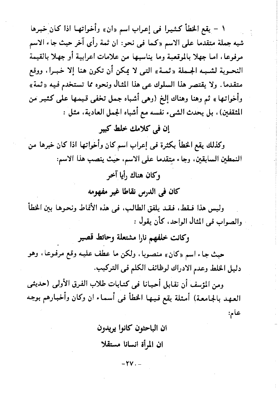ومن المؤسف أن نقابل أحيانا في كتابات طلاب الفرق الأولى "حديثي العهد بالجامعة" أمثلة يقع فيها الخطأ في أسماء إن وكان وأخبارهم بوجه عام: