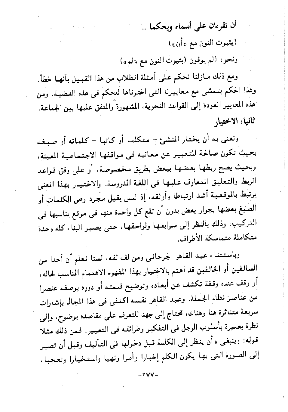 وباستثناء عبد القاهر الجرجاني ومن لف لفه، لسنا نعلم أن أحدًا من السالفين أو الخالفين قد اهتم بالاختيار بهذا المفهوم الاهتمام المناسب لحاله، أو وقف عنده وقفة تكشف عن أبعاده وتوضيح قيمته أو دوره بوصفه عنصرا من عناصر نظام الجملة. وعبد القاهر نفسه اكتفى في هذا المجال بإشارات سريعة متناثرة هنا وهناك، تحتاج إلى جهد للتعرف على مقاصده بوضوح، وإلى نظرة بصيرة بأسلوب الرجل في التفكير وطرائقه في التعبير. فمن ذلك مثلا قوله: وينبغي "أن ينظر إلى الكلمة قبل دخولها في التأليف وقبل أن تصير إلى الصورة التي بها يكون الكلم إخبارا وأمرا ونهيا واستخبارا وتعجبا،