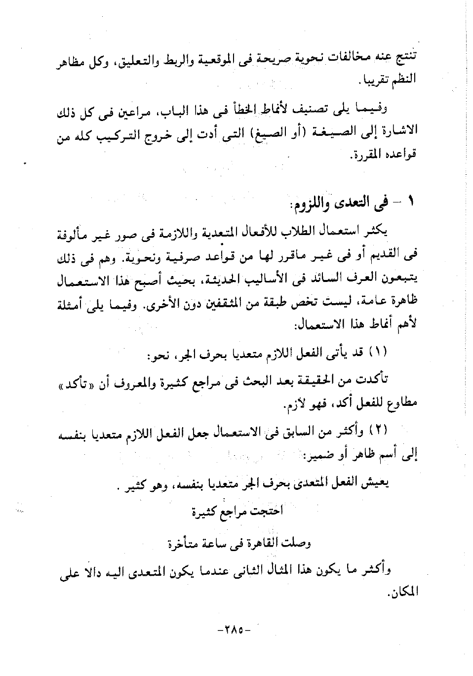 يكثر استعمال الطلاب للأفعال المتعدية واللازمة في صور غير مألوفة في القديم أو في غير ما قرر لها من قواعد صرفية ونحوية. وهم في ذلك يتبعون العرف السائد في الأساليب الحديثة، بحيث أصبح هذا الاستعمال ظاهرة عامة، ليست تخص طبقة من المثقفين دون الأخرى. وفيما يلي أمثلة لأهم أنماط هذا الاستعمال.