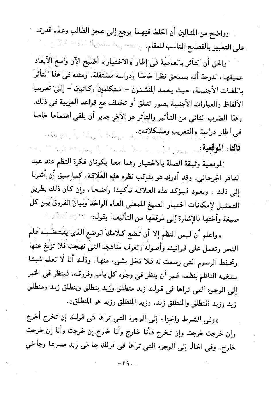 الموقعية وثيقة الصلة بالاختيار وهما معا يكونان فكرة النظم عند عبد القاهر الجرجاني. وقد أدرك هو بثاقب نظره هذه العلاقة، كما سبق أن أشرنا إلى ذلك. ويعود فيؤكد هذه العلاقة تأكيدا واضحا، وإن كان ذلك بطريق التمثيل لإمكانات اختيار الصيغ للمعنى العام الواحد وبيان الفروق بين كل صيغة وأختها بالإشارة إلى موقعها من التأليف. يقول: