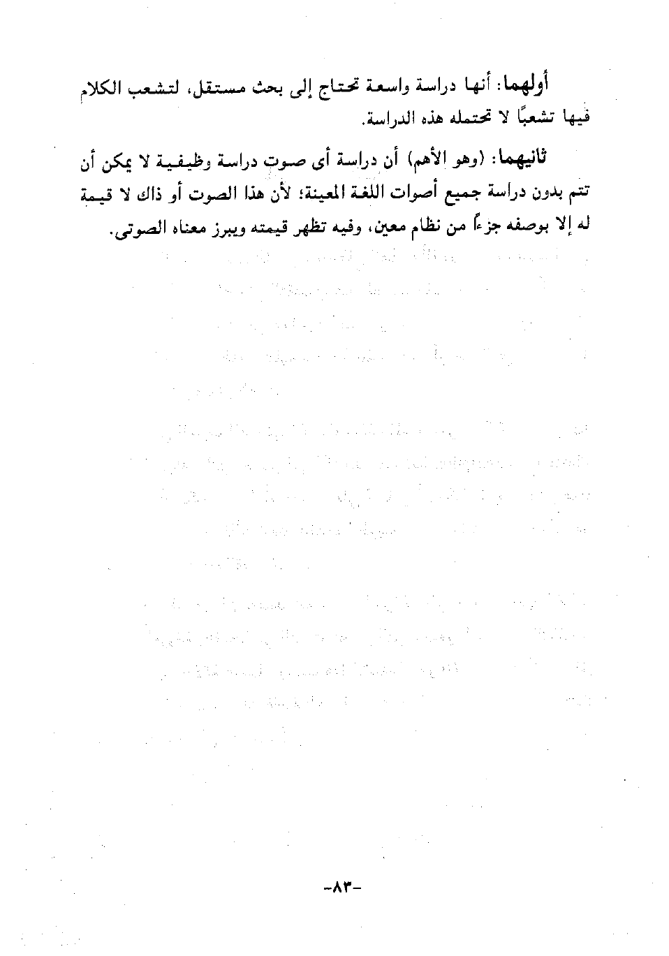 ثانيهما: "وهو الأهم" أن دراسة أي صوت دراسة وظيفية لا يمكن أن تتم بدون دراسة جميع أصوات اللغة المعينة، لأن هذا الصوت أو ذاك لا قيمة له إلا بوصفه جزءا من نظام معين، وفيه تظهر قيمته ويبرز معناه الصوتي.