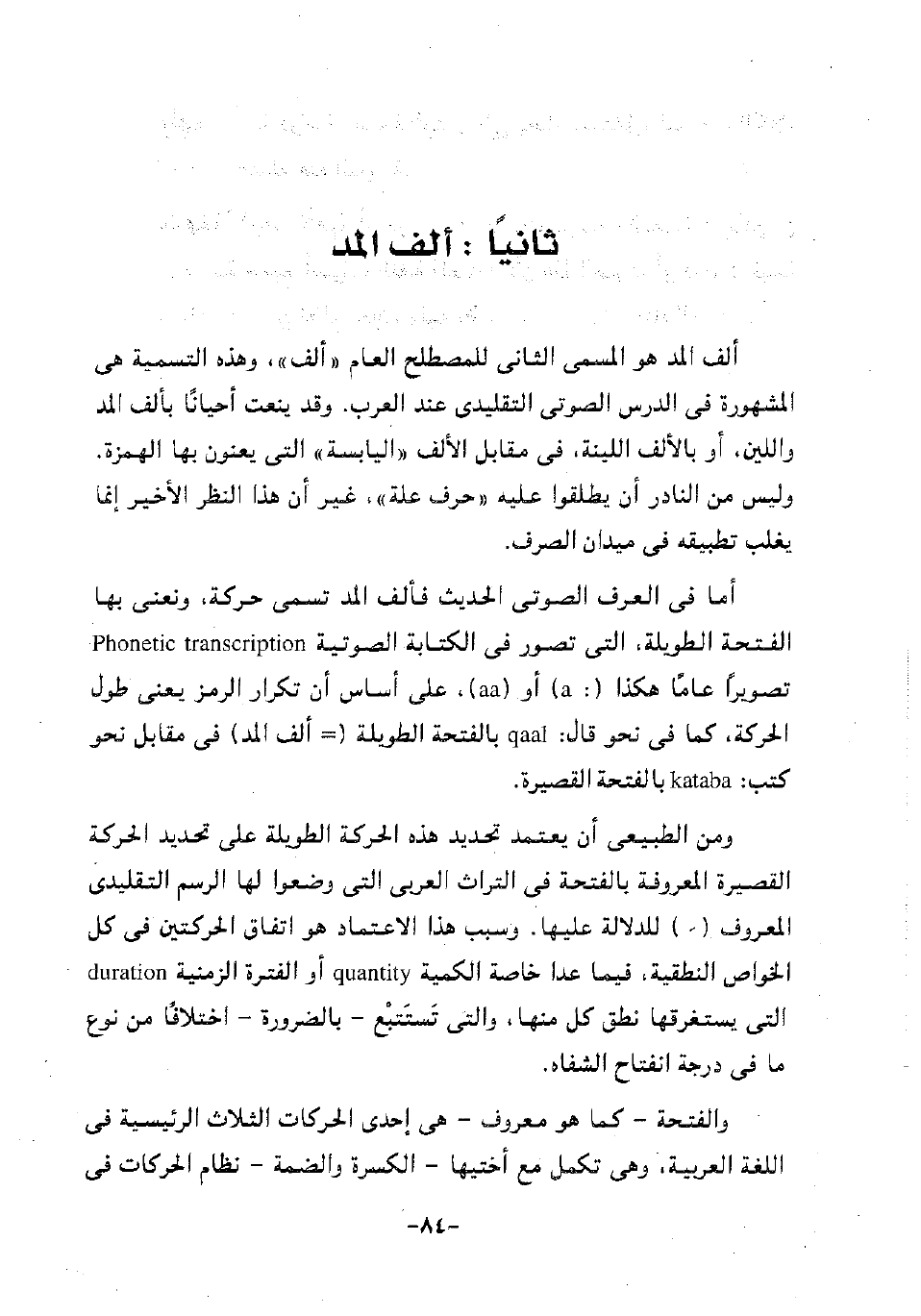 أما في العرف الصوتي الحديث فألف المد تسمى الحركة، ونعني بها الفتحة الطويلة، التي تصور في الكتابة الصوتية Phonetic transcription تصويرا عاما هكذا: "a" أو "aa"، على أساس أن تكرار الرمز يعني طول الحركة، كما في نحو قال: qaal بالفتحة الطويلة "= ألف المد" في مقابل نحو كتب: kataba بالفتحة القصيرة.