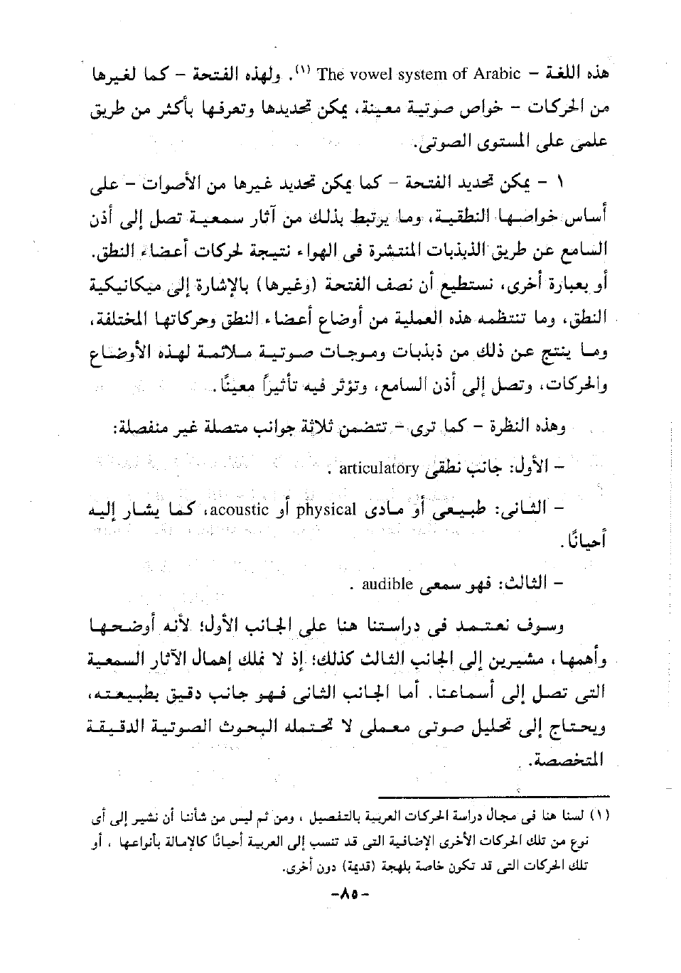 1 لسنا هنا في مجال دراسة الحركات العربية بالتفصيل، ومن ثم ليس من شأننا أن نشير إلى أي نوع من تلك الحركات الأخرى الإضافية التي قد تنسب إلى العربية أحيانا كالإمالة بأنواعها، أو تلك الحركات التي قد تكون خاصة بلهجة "قديمة" دون أخرى.