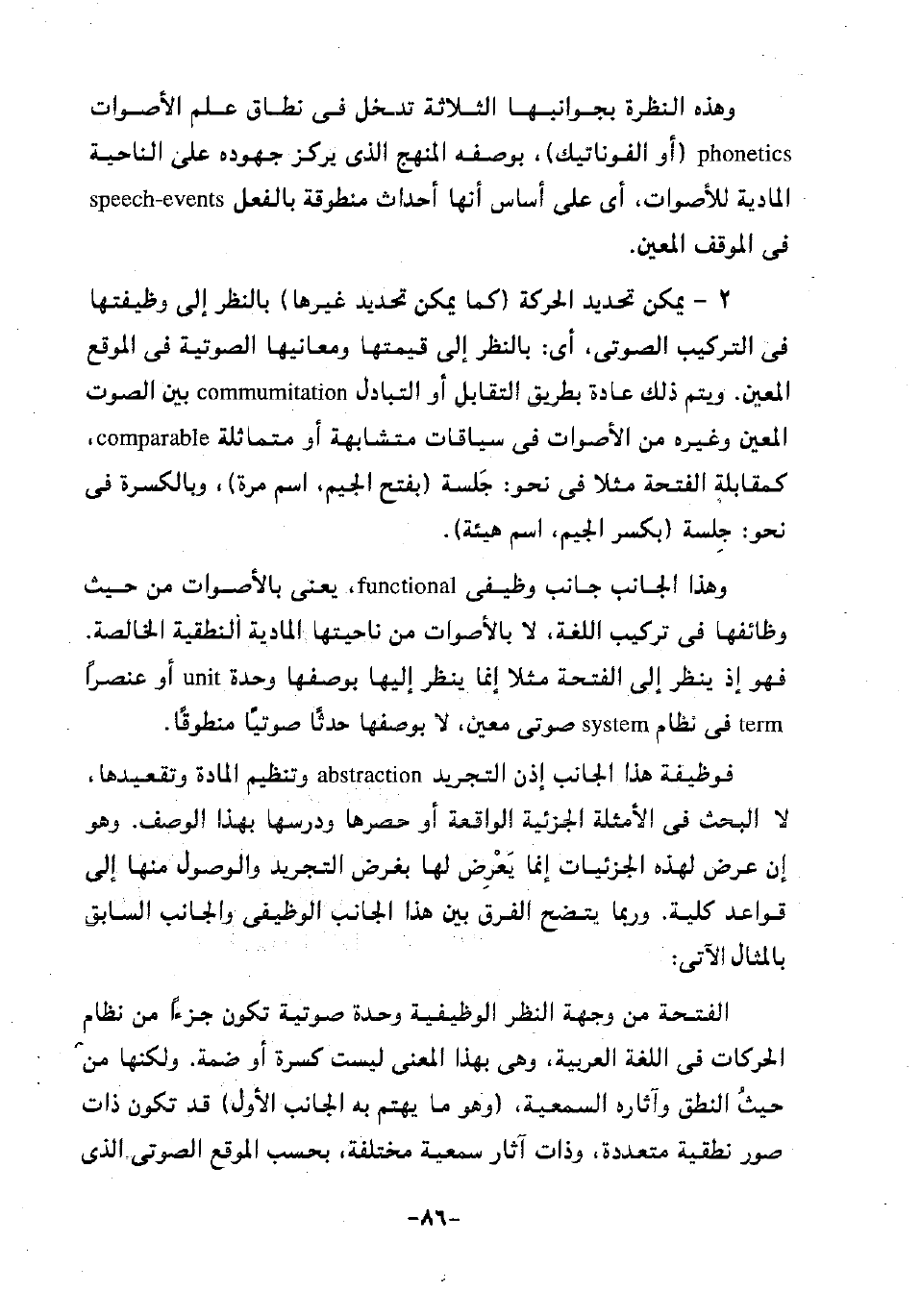 وهذا الجانب جانب وظيفي functional، يعني بالأصوات من حيث وظائفها في تركيب اللغة، لا بالأصوات من ناحيتها المادية النطقية الخالصة. فهو إذ ينظر إلى الفتحة مثلا إنما ينظر إليها بوصفها وحدة unit أو عنصرا term في نظام system صوتي معين، لا بوصفها حدثا صوتيا منطوقا.