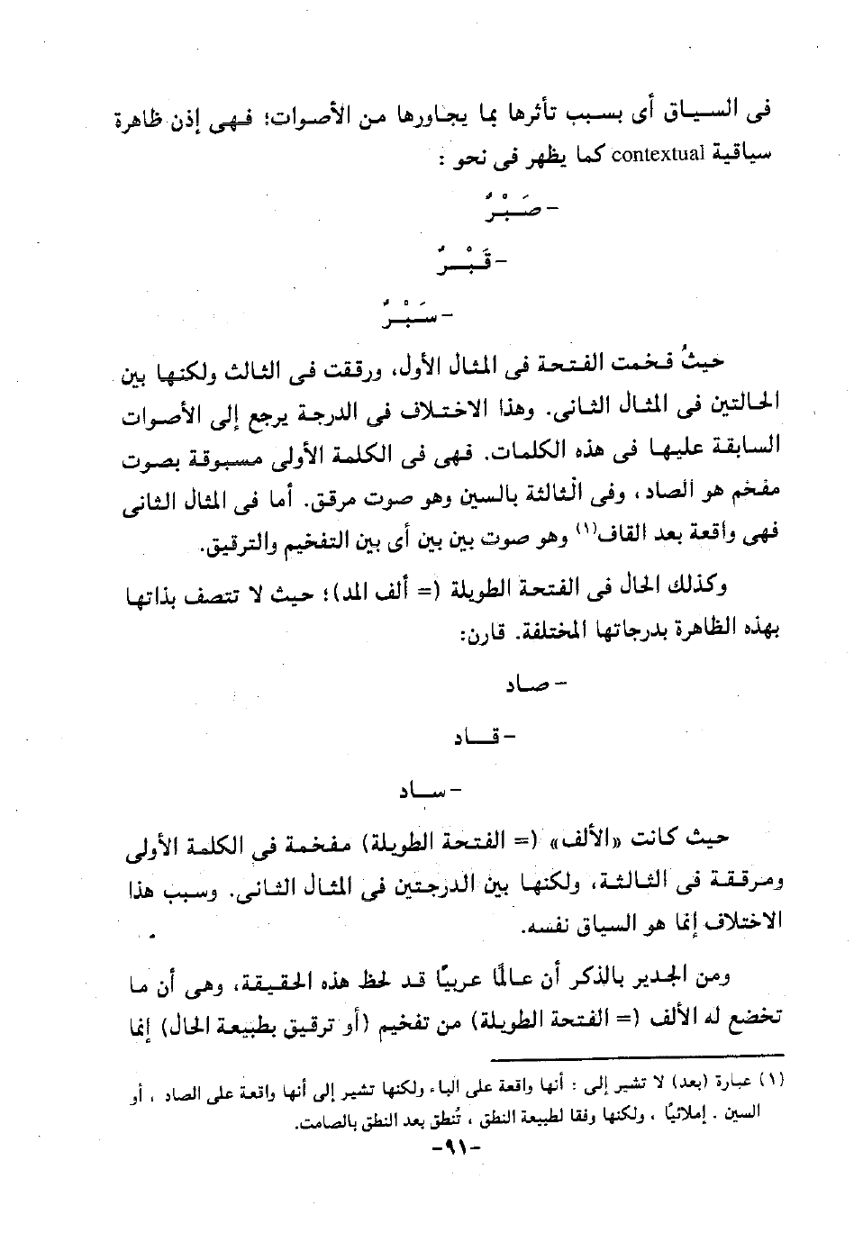 حيث كانت "الألف" "= الفتحة الطويلة" مفخمة في الكلمة الأولى ومرققة في الثالثة، ولكنها بين الدرجتين في المثال الثاني. وسبب هذا الاختلاف إنما هو السياق نفسه.