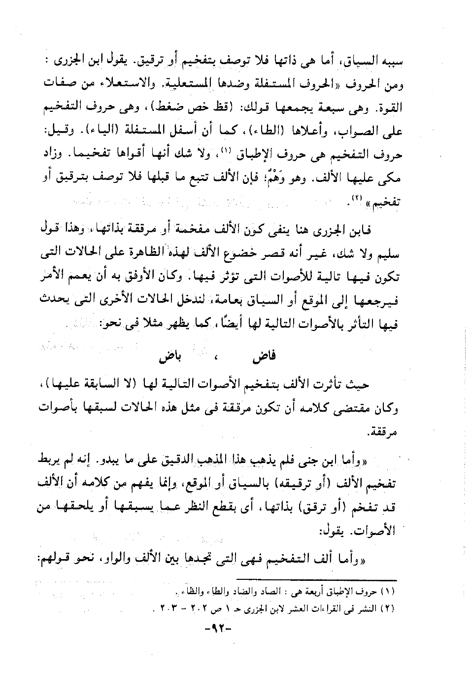 "وأما ابن جني فلم يذهب هذا المذهب الدقيق على ما يبدو. إنه لم يربط تفخيم الألف "أو ترقيقه" بالسياق أو الموقع، وإنما يفهم من كلامه أن الألف قد تفخم "أو ترقق" بذاتها، أي بقطع النظر عما يسبقها أو يلحقها من الأصوات. يقول: