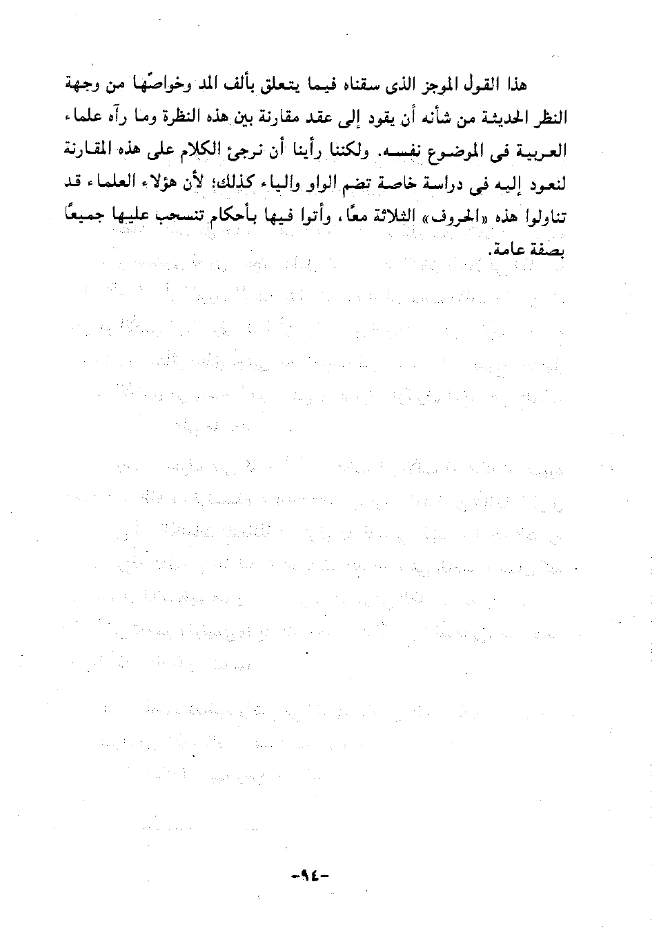هذا القول الموجز الذي سقناه فيما يتعلق بألف المد وخواصها من وجهة النظر الحديثة من شأنه أن يقود إلى عقد مقارنة بين هذه النظرة وما رآه علماء العربية في الموضوع نفسه. ولكننا رأينا أن نرجئ الكلام على هذه المقارنة لنعود إليه في دراسة خاصة تضم الواو والياء كذلك، لأن هؤلاء العلماء قد تناولوا هذه "الحروف" الثلاثة معا، وأتوا فيها بأحكام تنسحب عليها جميعا بصفة عامة.