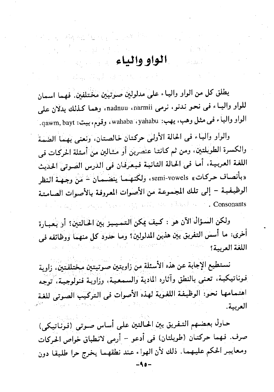 والواو والياء في الحالة الأولى حركتان خالصتان، ونعني بهما الضمة والكسرة الطويلتين، ومن ثم كانتا عنصرين أو مثالين من أمثلة الحركات اللغة العربية، أما في الحالة الثانية فيعرفان في الدرس الصوتي الحديث "بأنصاف حركات" semi-vowels، ولكنهما ينضمان -من وجهة النظر الوظيفية- إلى تلك المجموعة من الأصوات المعروفة بالأصوات الصامتة Consonants.