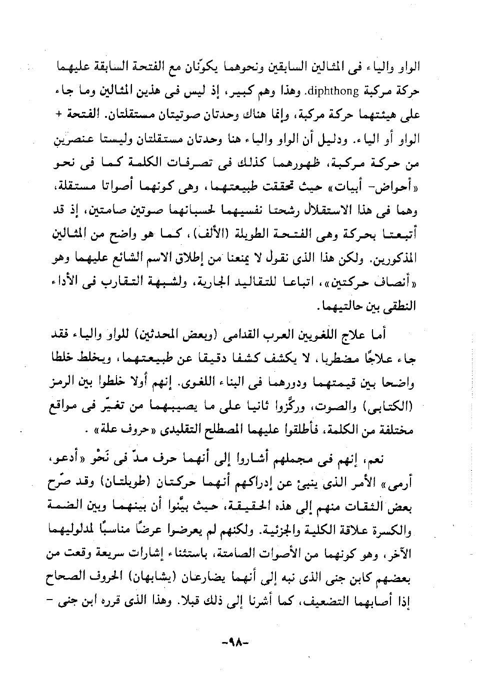 أما علاج اللغويين العرب القدامى "وبعض المحدثين" للواو والياء فقد جاء علاجا مضطربا، لا يكشف كشفا دقيقا عن طبيعتهما، ويخلط خلطا واضحا بين قيمتهما ودورها في البناء اللغوي. إنهم أولا خلطوا بين الرمز "الكتابي" والصوت، وركزوا ثانيا على ما يصيبهما من تغير في مواقع مختلفة من الكلمة، فأطلقوا عليهما المصطلح التقليدي "حروف علة".