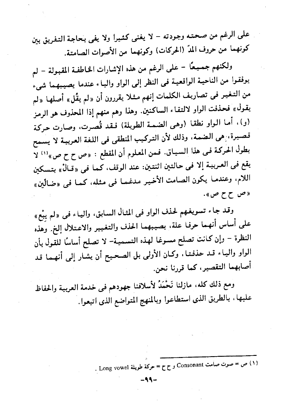 ولكنهم جميعا -على الرغم من هذه الإشارات الخاطفة المقبولة- لم يوفقوا من الناحية الواقعية في النظر إلى الواو والياء عندما يصيبهما شيء من التغير في تصاريف الكلمات إنهم مثلا يقررون أن "لم يقُل" أصلها "لم يقول": فحذفت الواو لالتقاء الساكنين. وهذا وهم منهم إذا المحذوف هو الرمز "و"، أما الواو نطقا "وهي الضمة الطويلة" فقد قُصرت، وصارت حركة قصيرة، هي الضمة، وذلك لأن التركيب المنطقي في اللغة العربية لا يسمح بطول الحركة في هذا السياق. فمن المعلوم أن المقطع: "ص ح ح ص"1 لا يقع في العربية إلا في حالتين اثنتين: عند الوقف، كما في "قال" بتسكين اللام، وعندما يكون الصامت الأخير مدغما في مثله، كما في "ضالين" "ص ح ح ص".