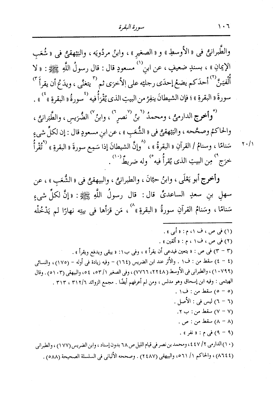 والطبراني في الأوسط والصغير ، وَابن مردويه والبيهقي في شعب الإيمان بسند ضعيف عن ابن مسعود قال : قال رسول الله صلى الله عليه وسلم لا ألقين أحدم يضع إحدى رجليه على الأخرى ثم يتعنى ويدع أن يقرأ سورة البقرة فإن الشيطان ينفر من البيت الذي يقرأ فيه سورة البقرة.