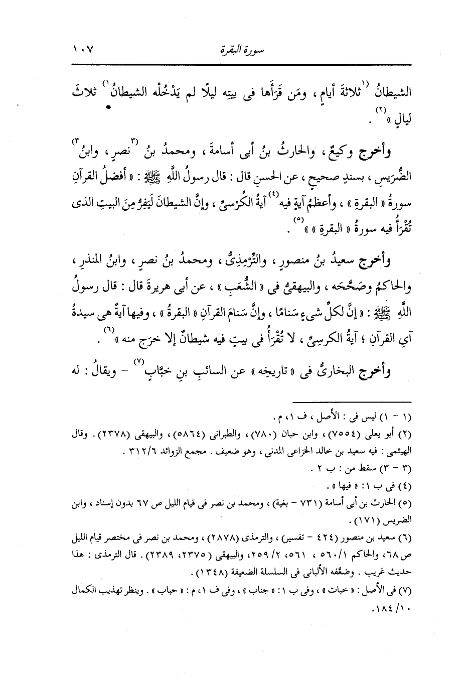 وأخرج سعيد بن منصور والترمذي ومحمد بن نصر ، وَابن المنذر والحاكم وصححه والبيهقي في الشعب عن أبي هريرة قال : قال رسول الله صلى الله عليه وسلم إن لكل شيء سناما وإن سنام القرآن البقرة وفيها آية هي سيدة أي القرآن آية الكرسي لا تقرأ في بيت فيه شيطان إلا خرج منه.