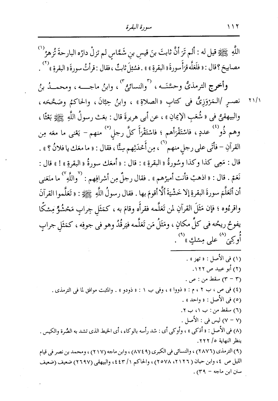 الله صلى الله عليه وسلم قيل له : ألم تر أن ثابت بن قيس بن شماس لم تزل داره الباحة تزهر مصابيح قال : فلعله قرأ سورة البقرة فسئل ثابت فقال :قرأت سورة البقرة".