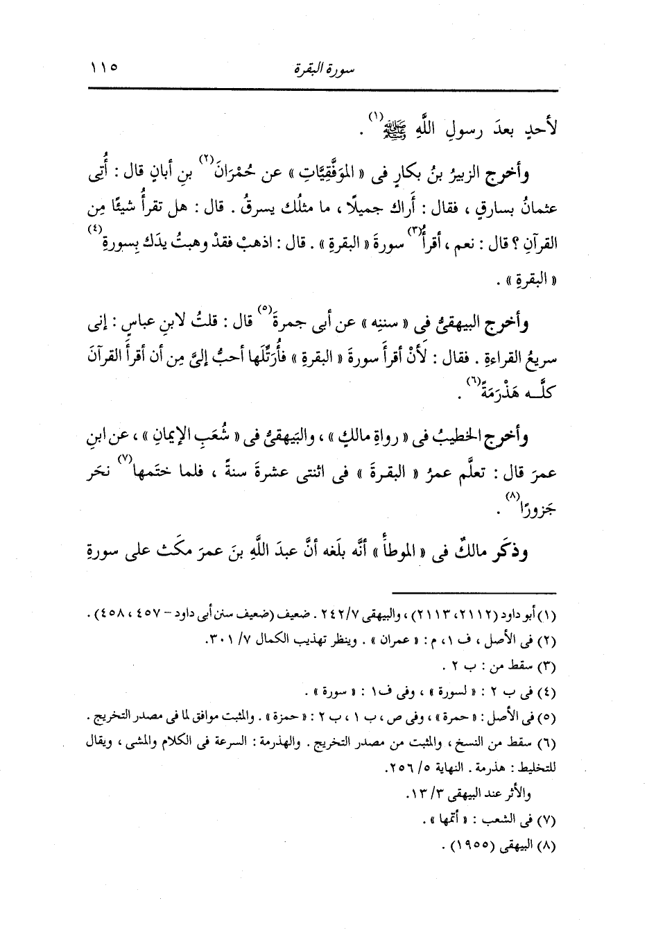 وأخرج البيهقي في "سُنَنِه" عن أبي جمرة قال : قلت لإبن عباس : إني سريع القراءة فقال : لأن أقرأ سورة البقرة فأرتلها أحب إلي من أن أقرأ القرآن كله.