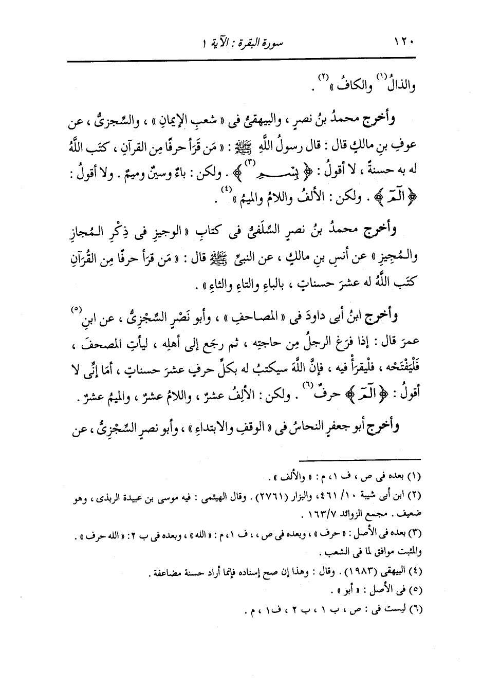 وأخرج محمد بن نصر السلفي في كتاب الوجيز في ذكر المجاز والمجيز عن أنس بن مالك عن النَّبِيّ صلى الله عليه وسلم قال من قرأ حرفا من القرآن كتب الله له عشر حسنات ، بالباء والتاء والثاء.