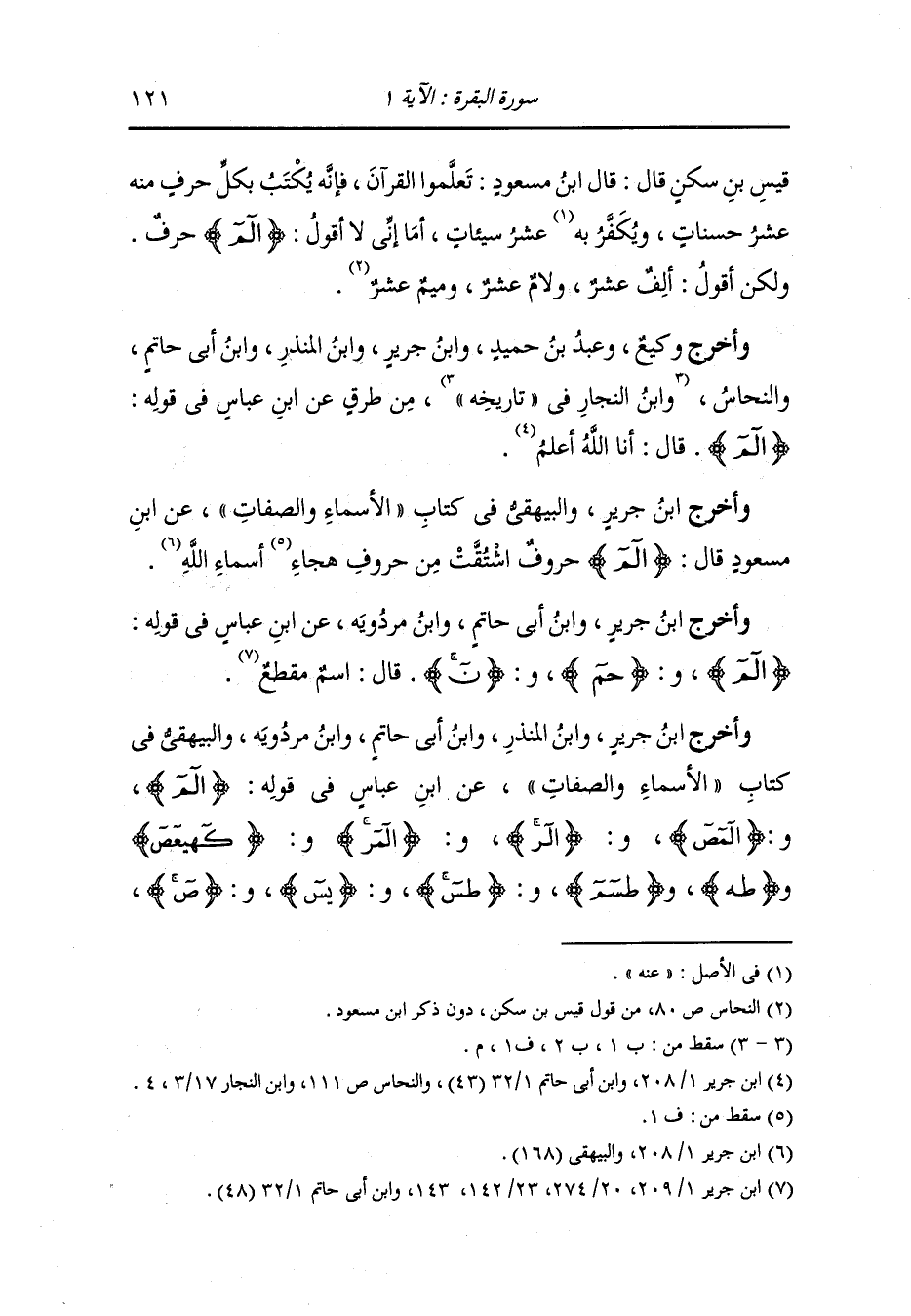 وأخرج ابن جرير ، وَابن المنذر ، وَابن أبي حاتم ، وَابن مردويه والبيهقي في كتاب الأسماء عن ابن عباس في قوله ألم و(المص) و(الر) و(المر)