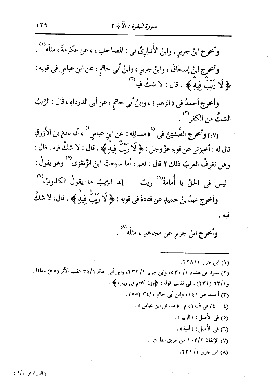 وأخرج ابن اسحاق ، وَابن جَرِير ، وَابن أبي حاتم عن ابن عباس في قوله {لا ريب فيه} قال : لا شك فيه.