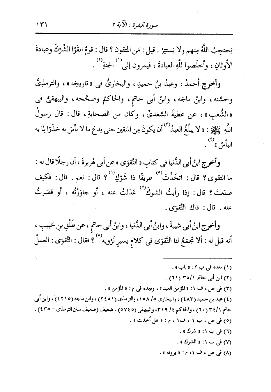 وأخرج أحمد ، وعَبد بن حُمَيد والبخاري في تاريخه والترمذي وحسنه ، وَابن ماجه ، وَابن أبي حاتم والحاكم وصححه والبيهقي في الشعب عن عطية السعدي وكان من الصحابة قال : قال رسول الله صلى الله عليه وسلم لا يبلغ العبد المؤمن أن يكون من المتقين حتى يدع ما لا بأس به حذرا لما به بأس.